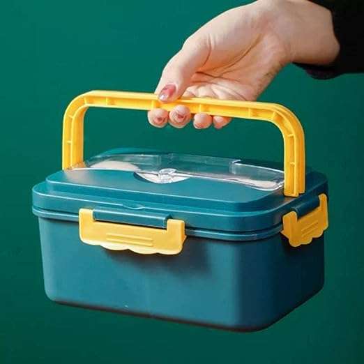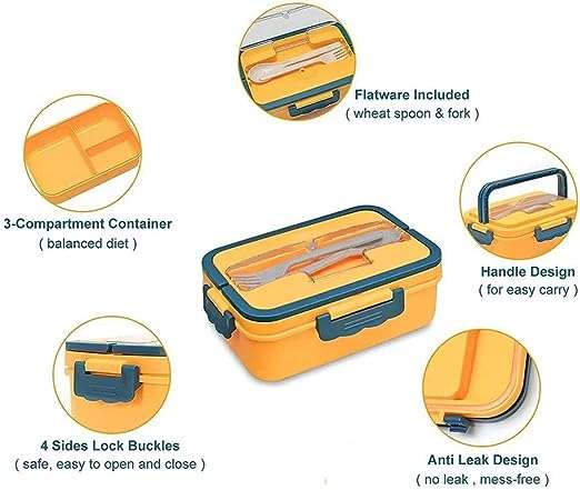 • المميزات: • تقدر تدخل اللانش بوكس الميكرويف من غير ما تقلق. • بييجي معاه مج للشوربة أو الحاجات السائلة. • مصنوع من مواد آمنة. • ليه أربع أقفال عشان تضمن ان الأكل ميقعش. • متقسم من الداخل 3 أجزا