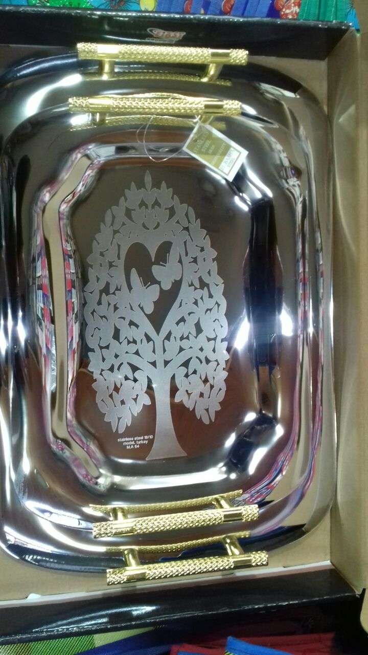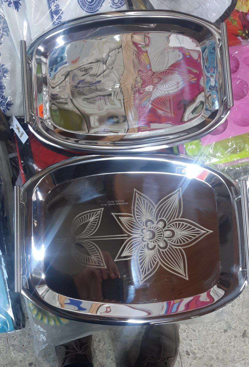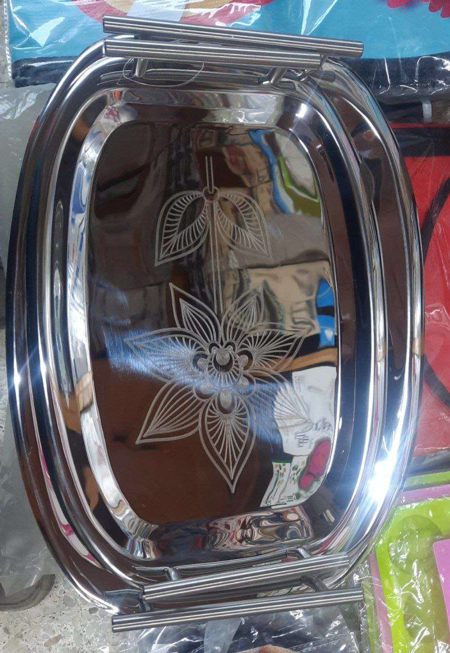 طقم صواني استانلس ١٨/١٠ علي المغناطيس مكون من قطعتين بيدين مرسوم صينية مقاس ٣٠سم والكبيرة مقاس ٣٥سم بسعر 500ج واخر صورة علي الطبيعة
