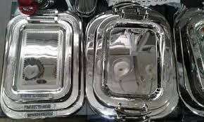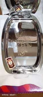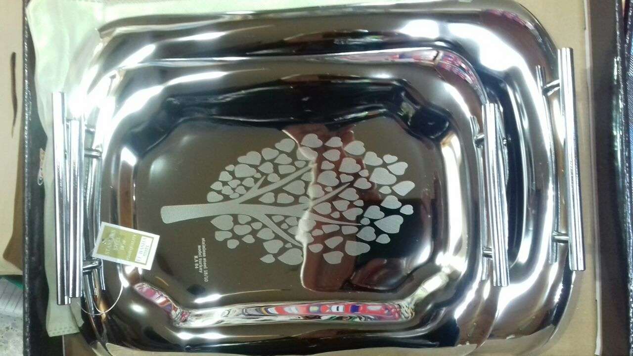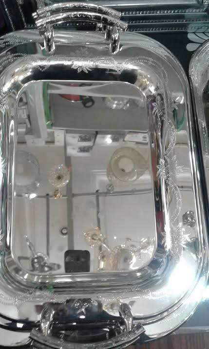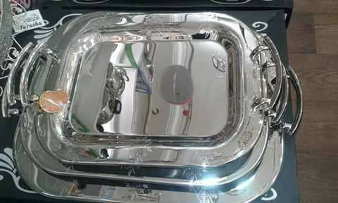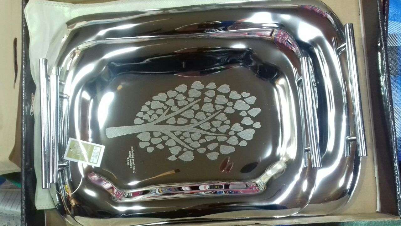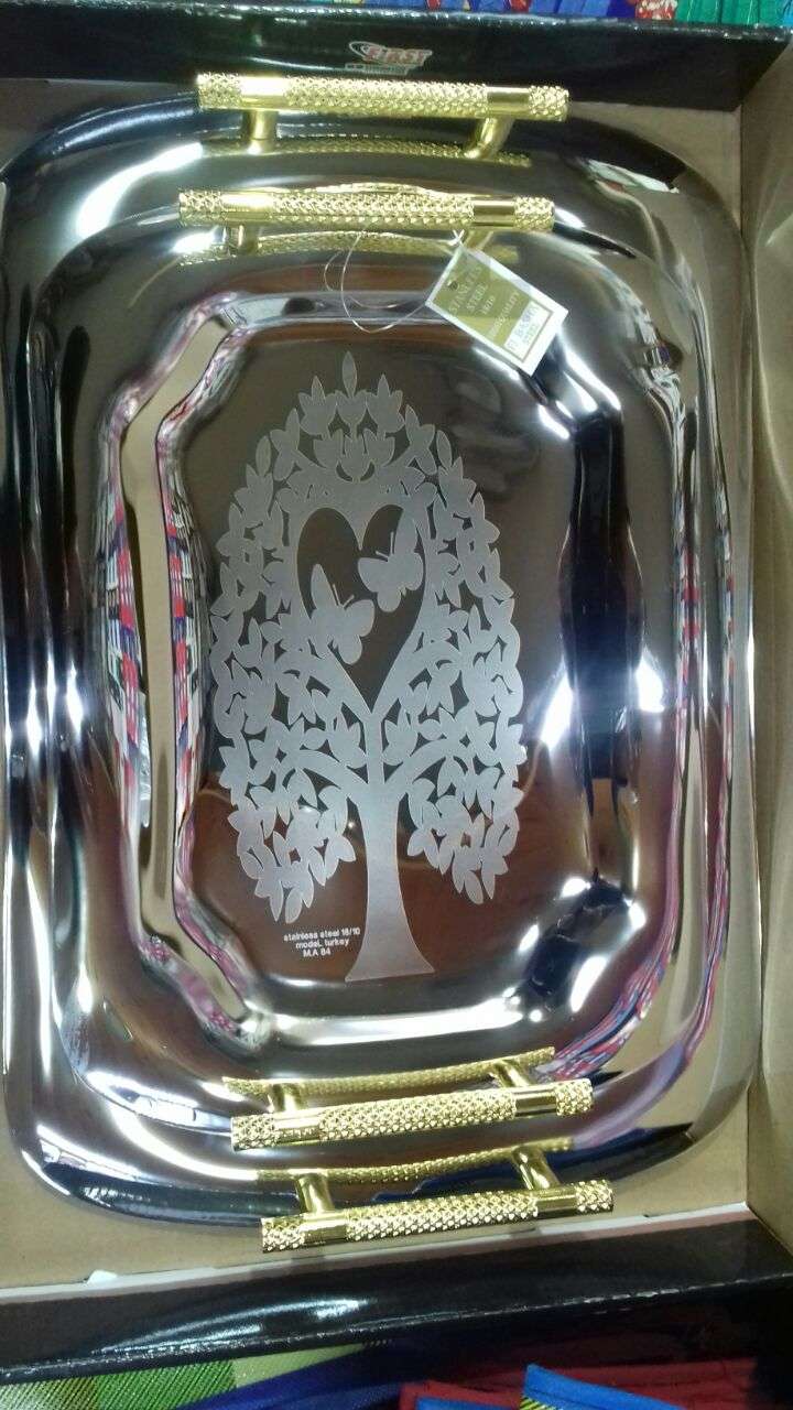 طقم صواني استانلس ١٨/١٠ علي المغناطيس مكون من قطعتين بيدين مرسوم صينية مقاس ٣٠سم والكبيرة مقاس ٣٥سم بسعر 500ج واخر صورة علي الطبيعة