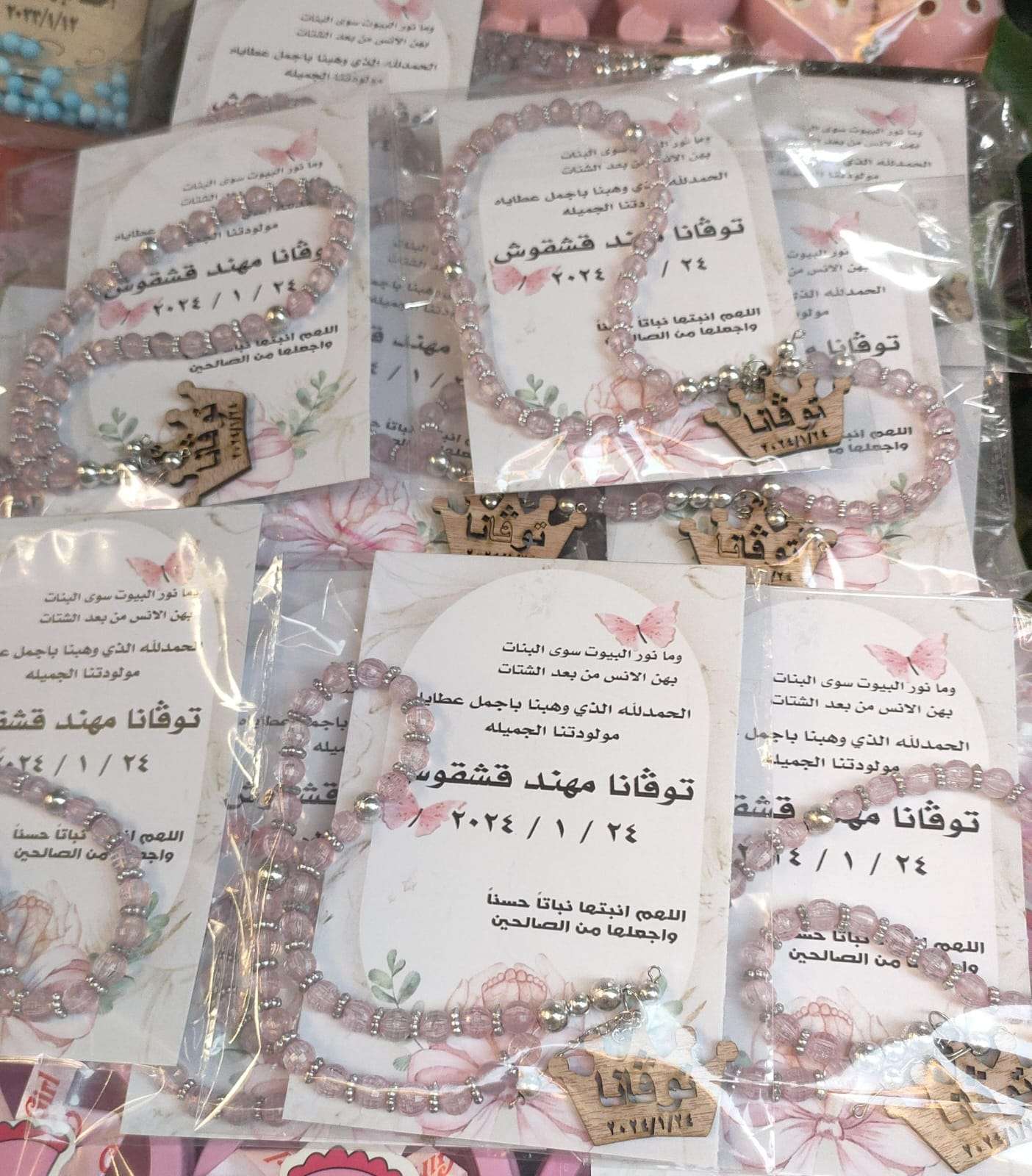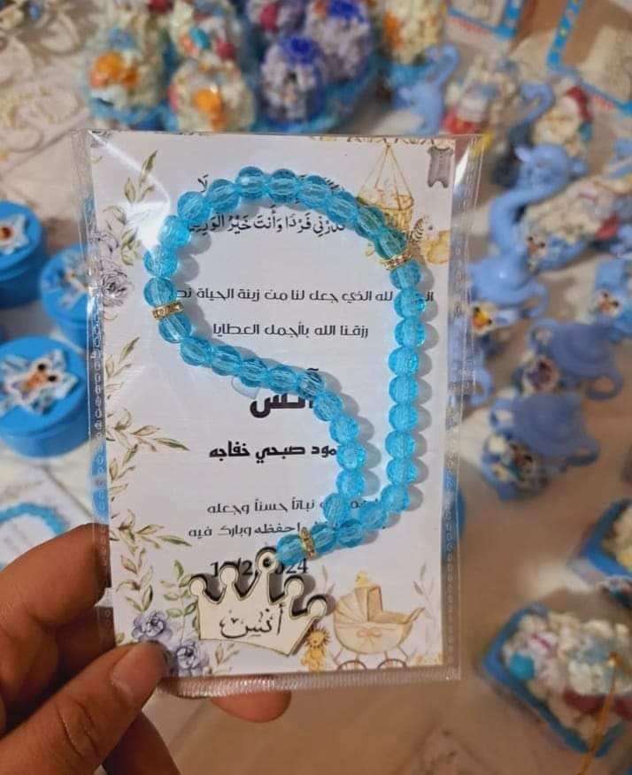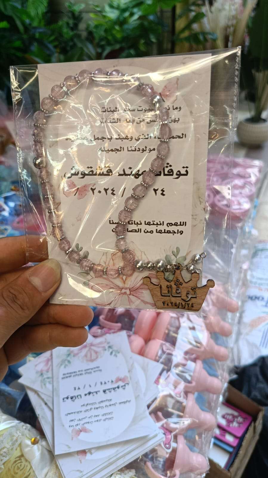 كارت مطبوع عليه الاسم والتاريخ ودعاء للبيبي مع سبحه بكوين خشب محفور عليها الاسم والتاريخ https://www.facebook.com/groups/211400489786684/