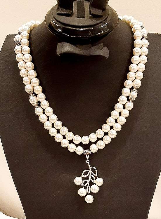 عقد جميل وشيك من اللولى الاوف وايت متوسط الطول ويوجد سلسلة لتطويل ودلاية فضي جميلة