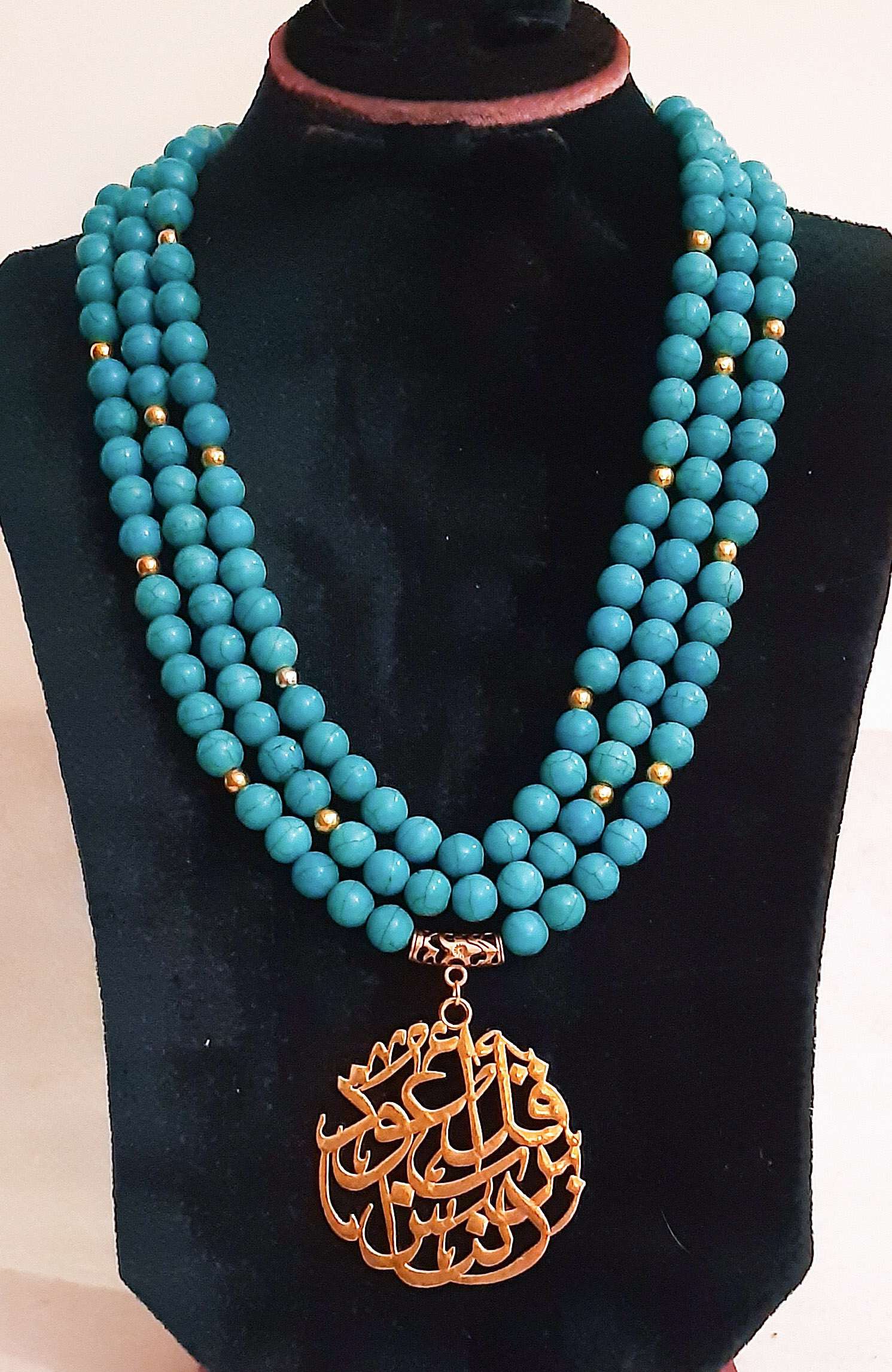 عقد جميل وشيك من الفيروز التركواز متوسط الطول ويوجد سلسلة لتطويل ومزين بدلاية ذهبية جميلة (قل اعوذ برب الناس)