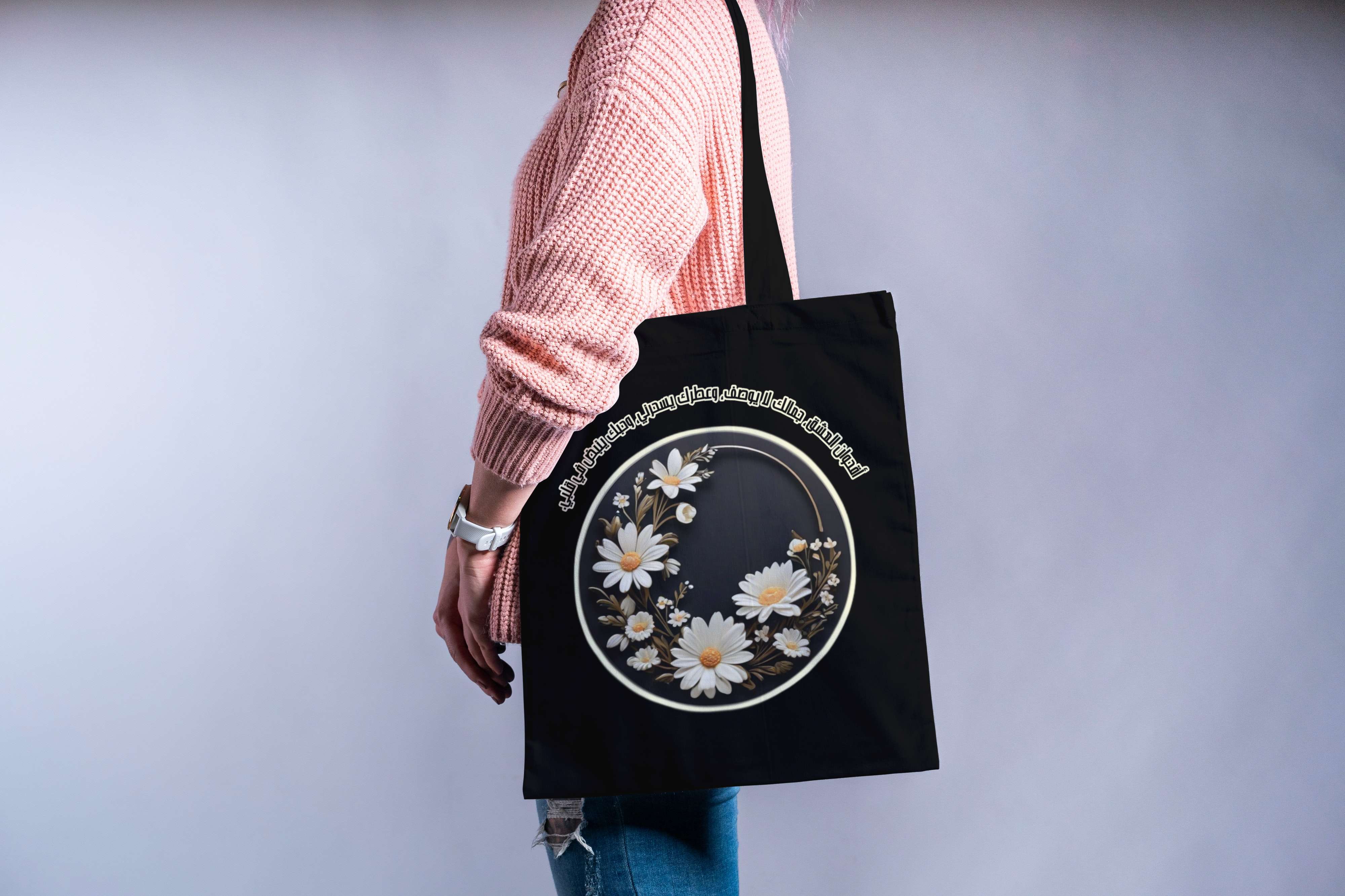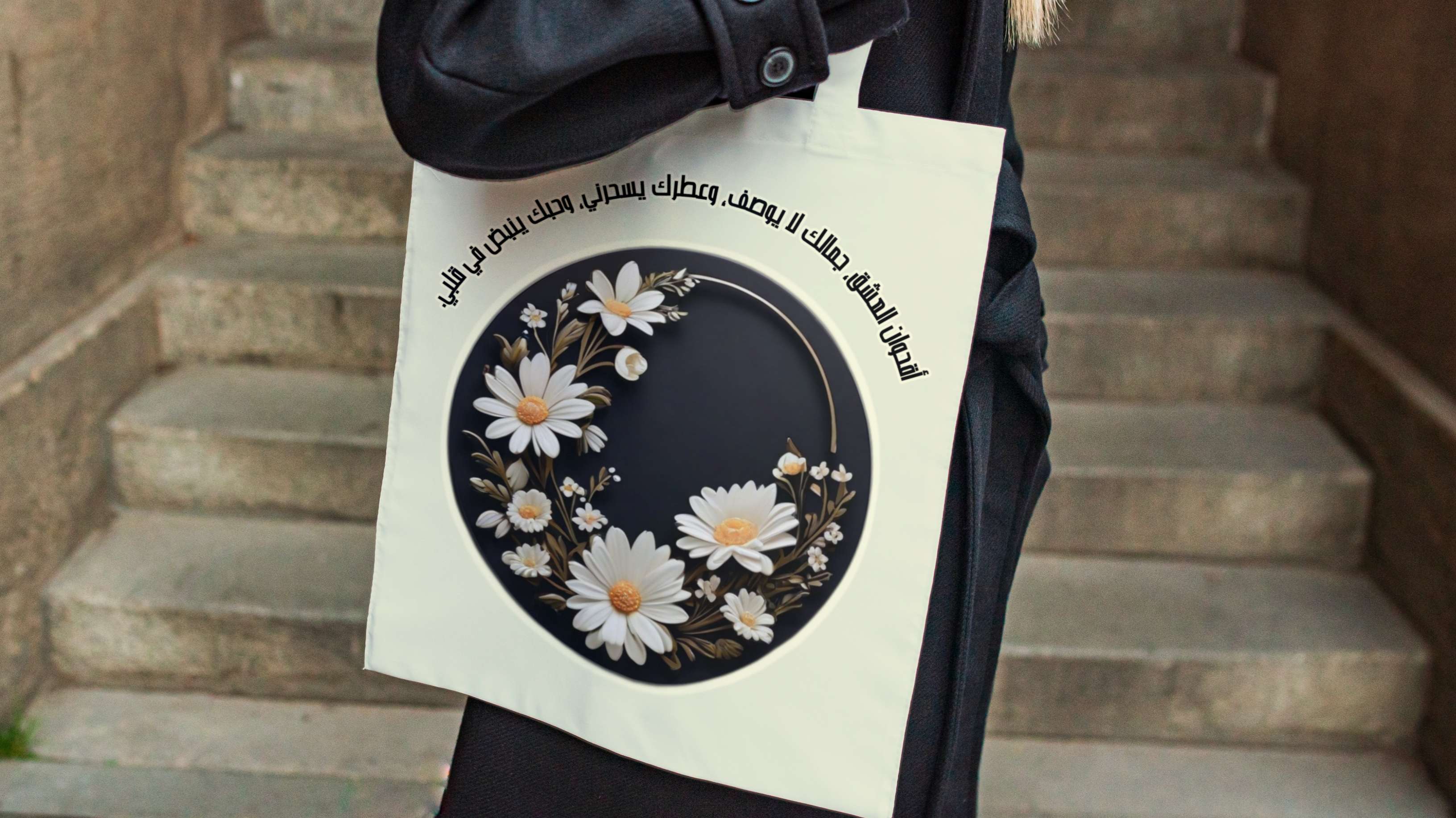 شنطة توتي باج زهور الأقحوان _ Daisy flowers مع مقولة رومانسية تعبر عن جمال الحب، وسحره، ونبضه في قلب المحب. فالأقحوان هي زهرة العشق، وجمالها لا يوصف، وعطرها يسحر المحب، وحبها ينبض في قلبه. مقولة قصيرة