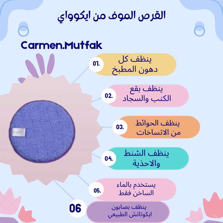 القرص الموف بينضف بقع الكنب والسجاد والحوائط وينظف دهون المطبخ الشفاط والسيراميك والشفاط والبوتجاز والأدوات الكهربائية والشنط والأحذية تنظف بالماء الساخن فقط ويستخدم في التنظيف صابونة ايكوتاتش الطبيع