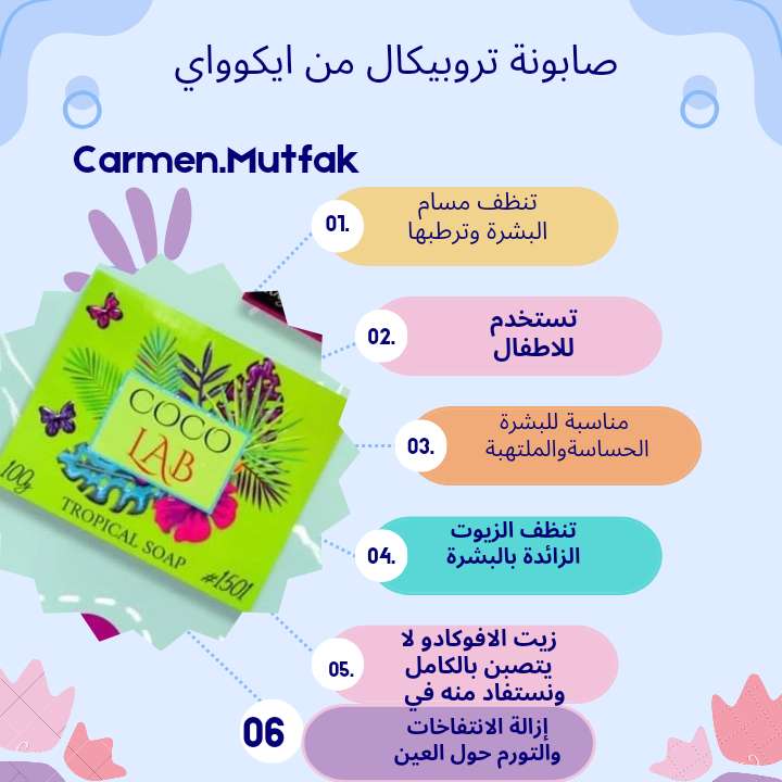 صابونة تروبيكال بزيوت طبيعية 100% صابون استوائي يجعل البشرة رطبة وتطيل شباب البشرة وتفتيح المسام وتنظيفها بلطف من الشوائب وتحفز انتاج الكولاجين والهيالورونيك مما يساعد علي مكافحة الجلد الطبيعي للش