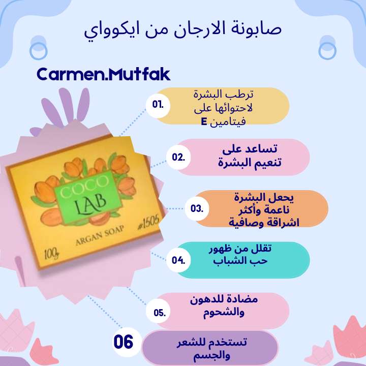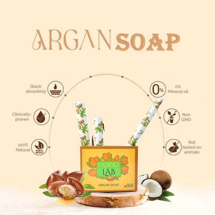 صابونة الارجان تحتوي علي زيوت طبيعية 100% زيت الارجان معروف باسم الذهب السائل يغذي بشرتك بالرطوبة والفيتامينات ومضادات الأكسدة مما يعزز البشرة الناعمة والمشرقة مناسبة لكل انواع البشرة يجعل بشرتك صح