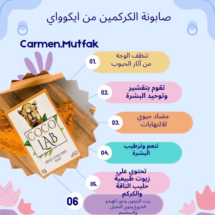 صابونة الكركمين بلبن الناقة بزيوت طبيعية 100% تم مزج المكونات علي البارد للاحتفاظ بخواصها هدية الشباب والجمال مجتمعة من الاروفيديا الهندية واسرار كليوباترا تتجسد في صابونة الكركمين الحليبي توحد ل