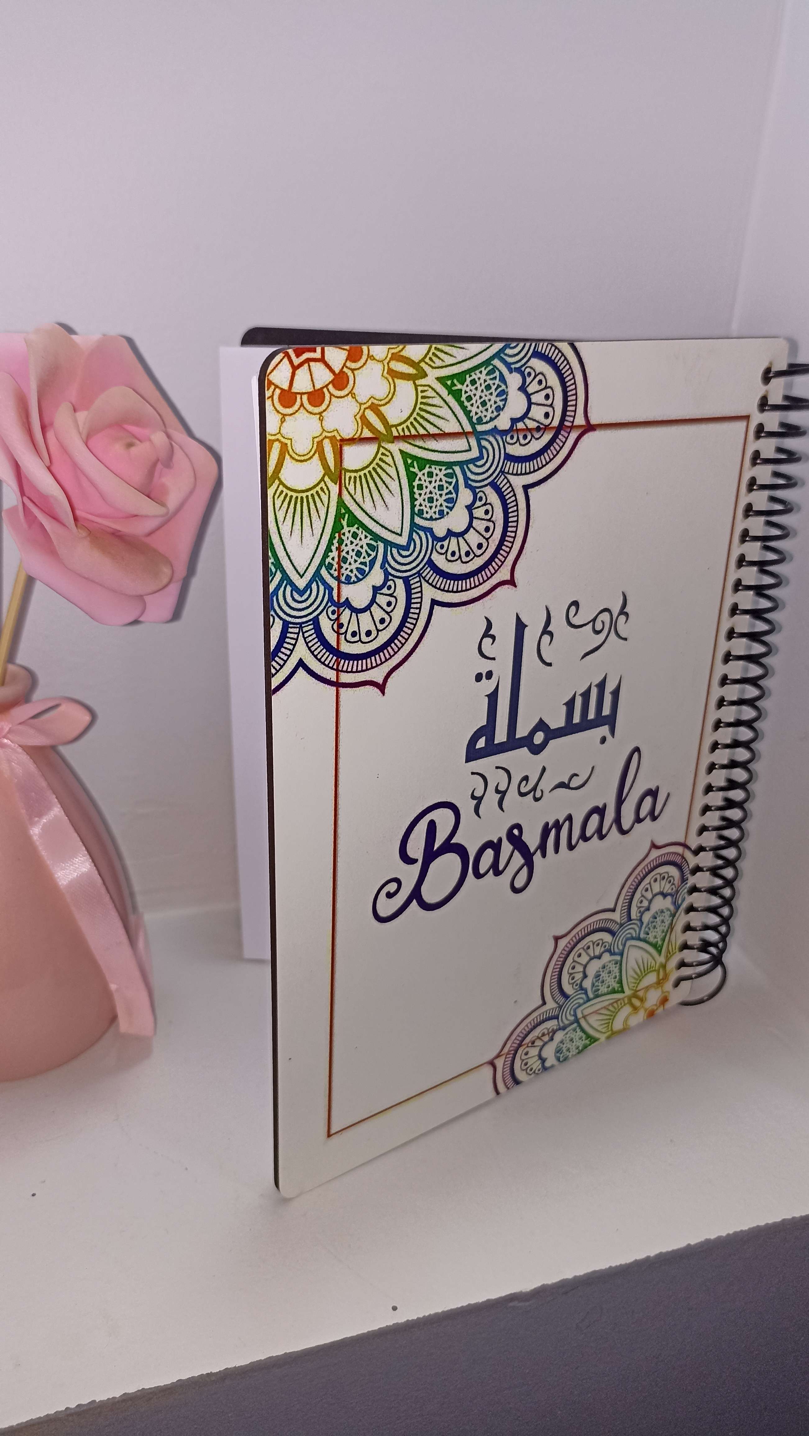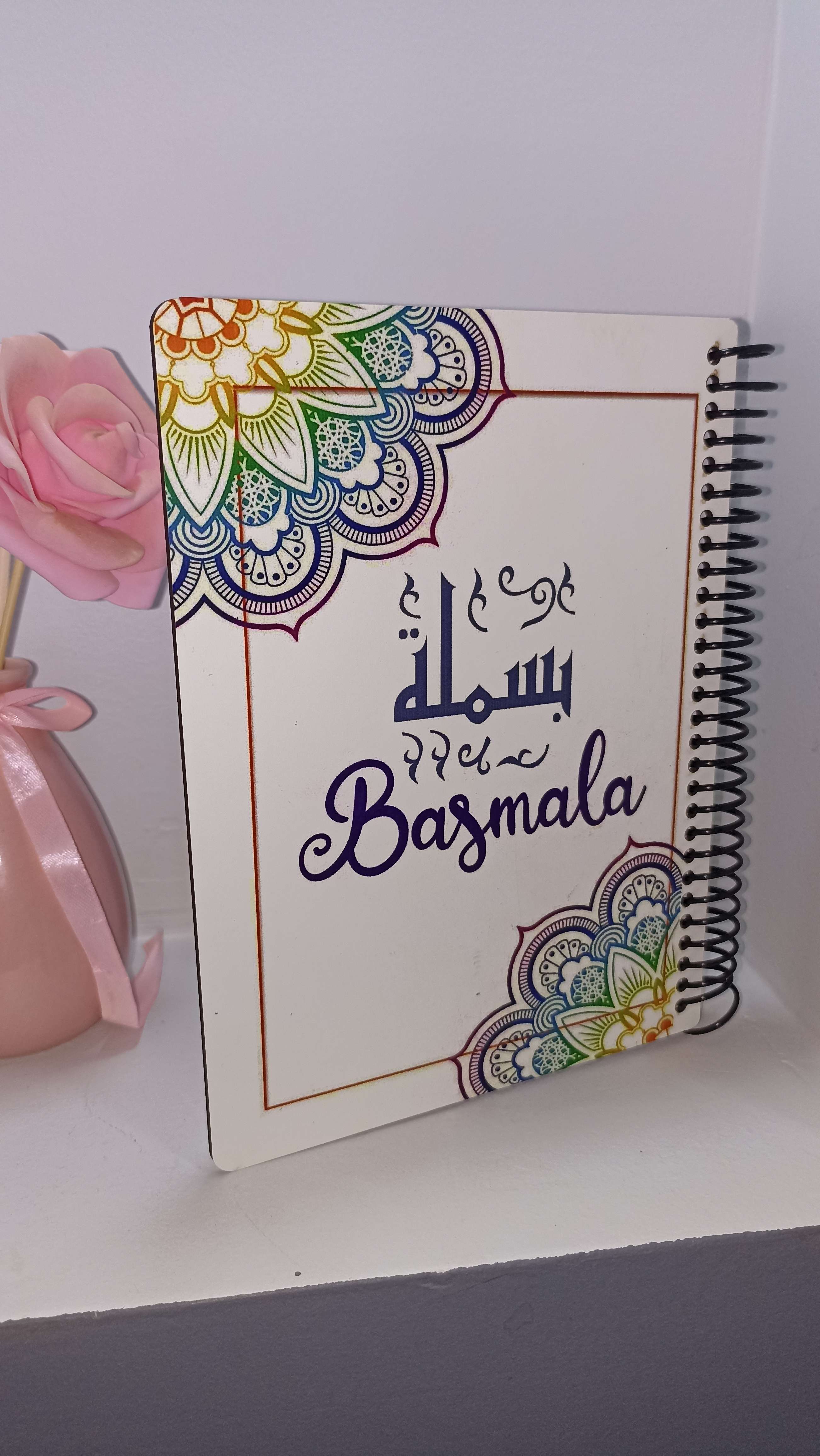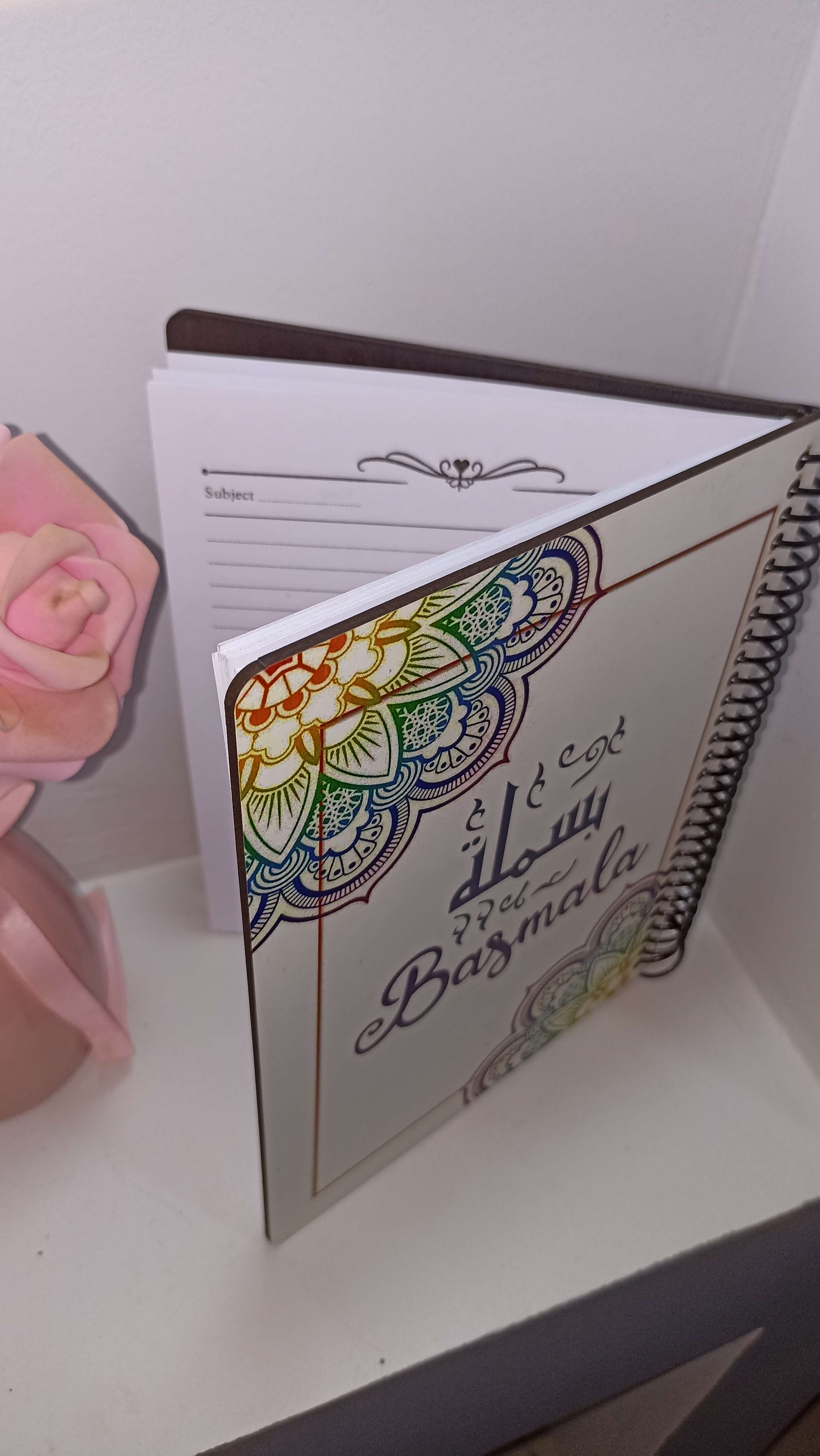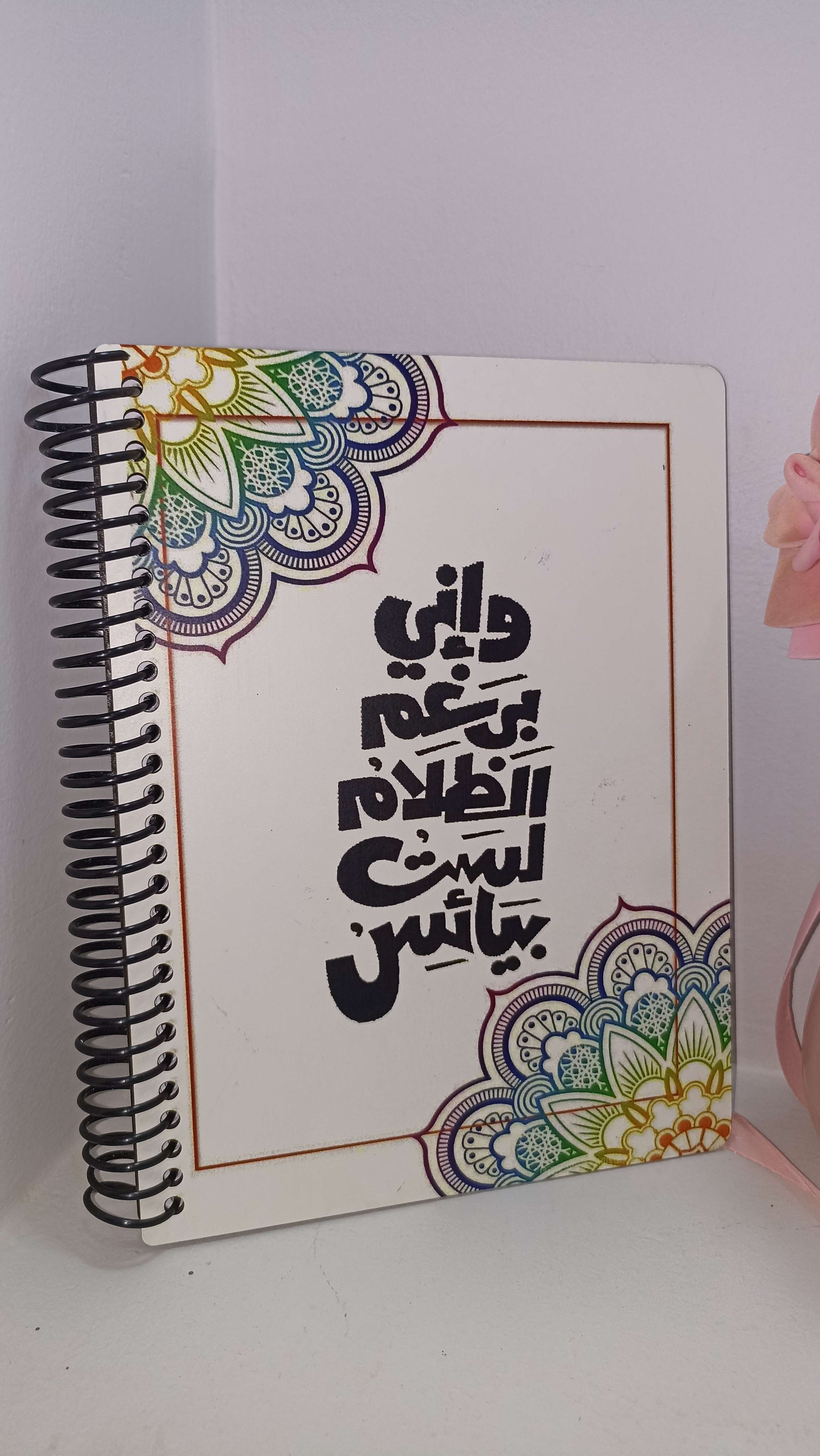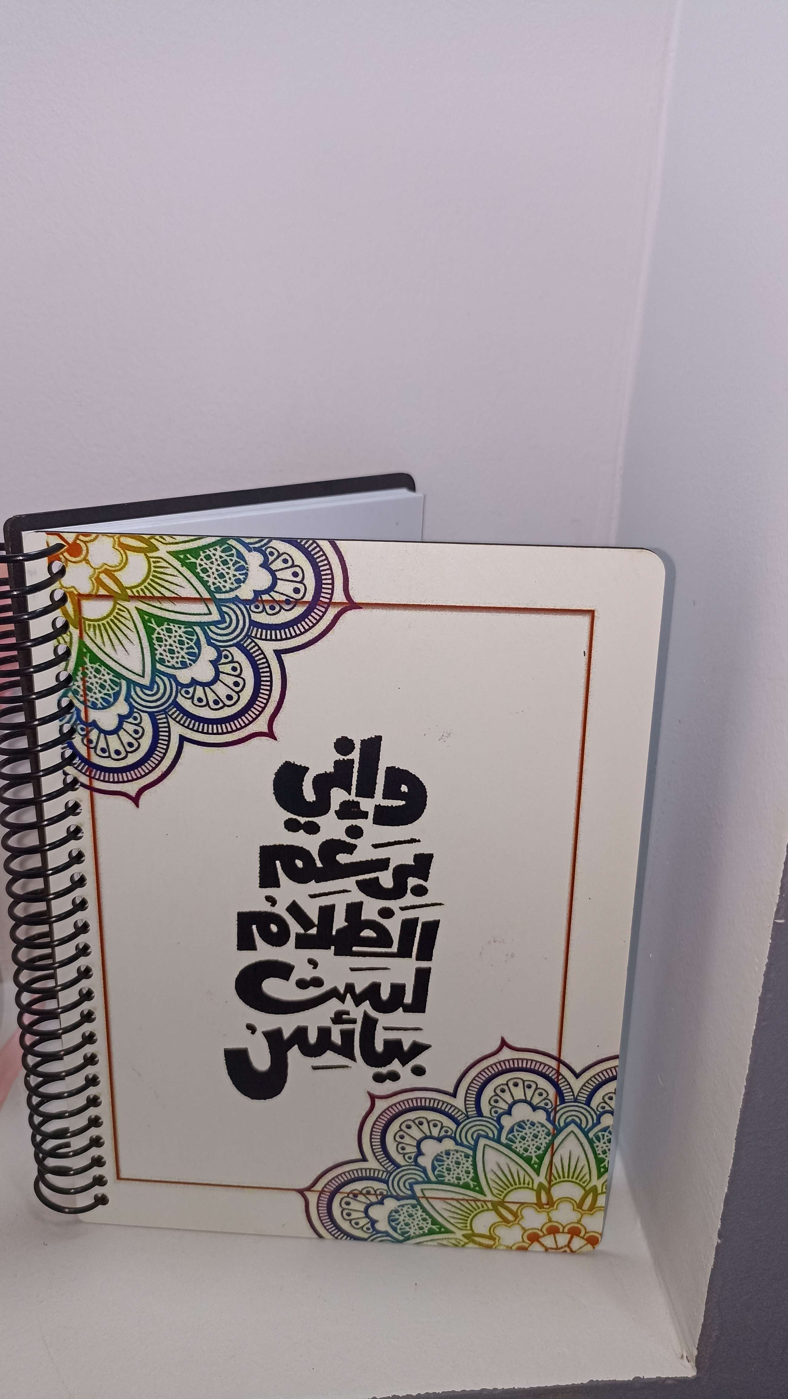 توت بوك مقاس وسط a5 غلاف خشب طباعة وش وضهر وممكن الاستفادة من العرض النوت بوك ومج ابيض وكوستر وميدالية خشب نفس التصميم متاح تغيير مقاس النوت بوك كبير a4 او صغير مقاس a6