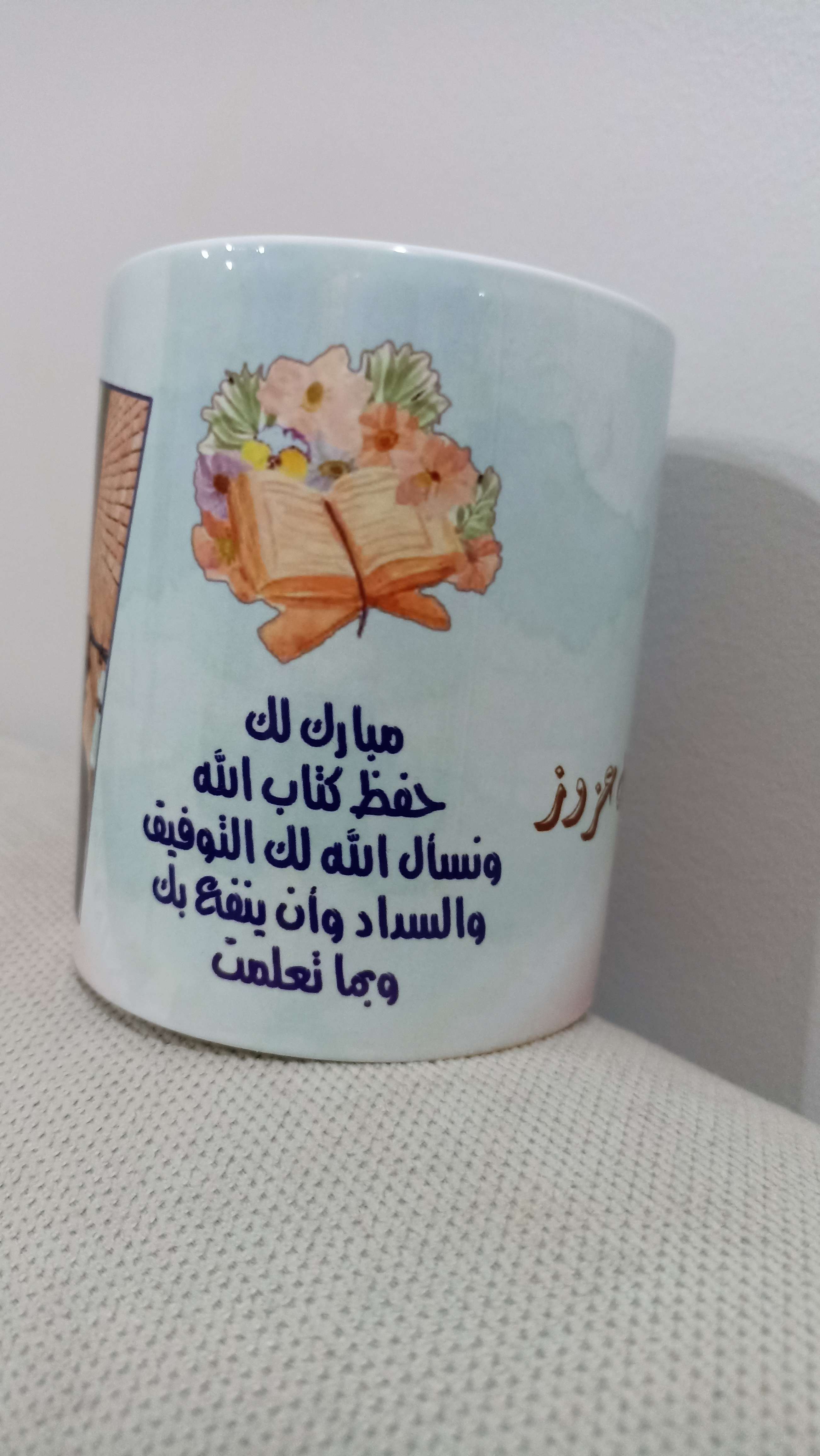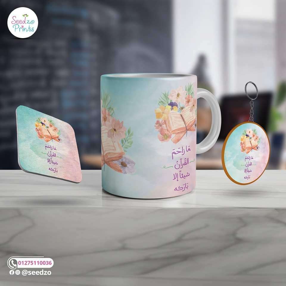 مج ابيض طباعه سبلميشن مع ميدالية وكوستر خشب بنفس التصميم