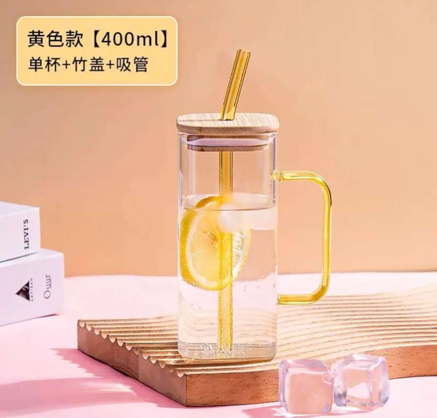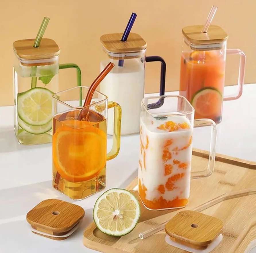 كوب زجاجي مربع سعة 400 مل بغطاء خشبي وشالميو او غير مستقيم للنار، كوب عصير وكوكتيلات للمشروبات الباردة والساخنة من بايركس (شفاف، غطاء خشبي وشلمو)، من يير، خشب زجاج بايركس