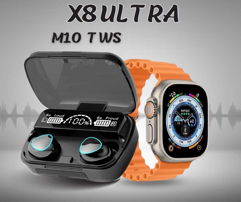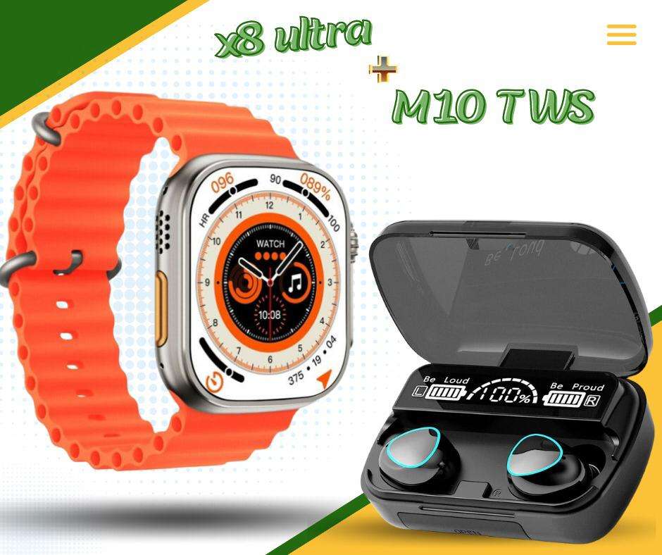 M10+X8 Ultra الساعة الالترا والسماعه m10 الأكثر طلباً والأكثر مبيعاً ⬛المواصفات والمميزات للساعه ⬅️ مقاس 49مم فعلي ⬅️فيها 4 مسامير فى ضهر الساعة ✅فيها اللوك لقفل الاستيك بتاع الساعة ✅شح