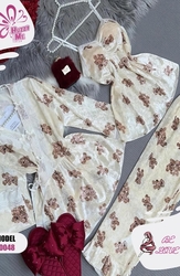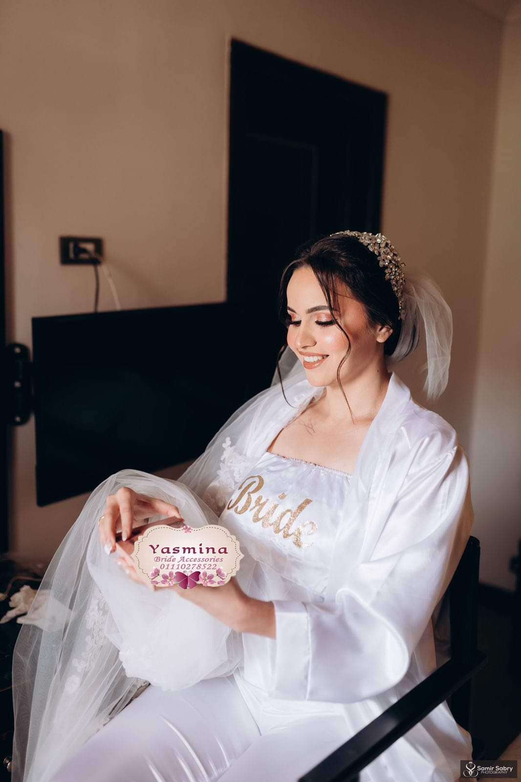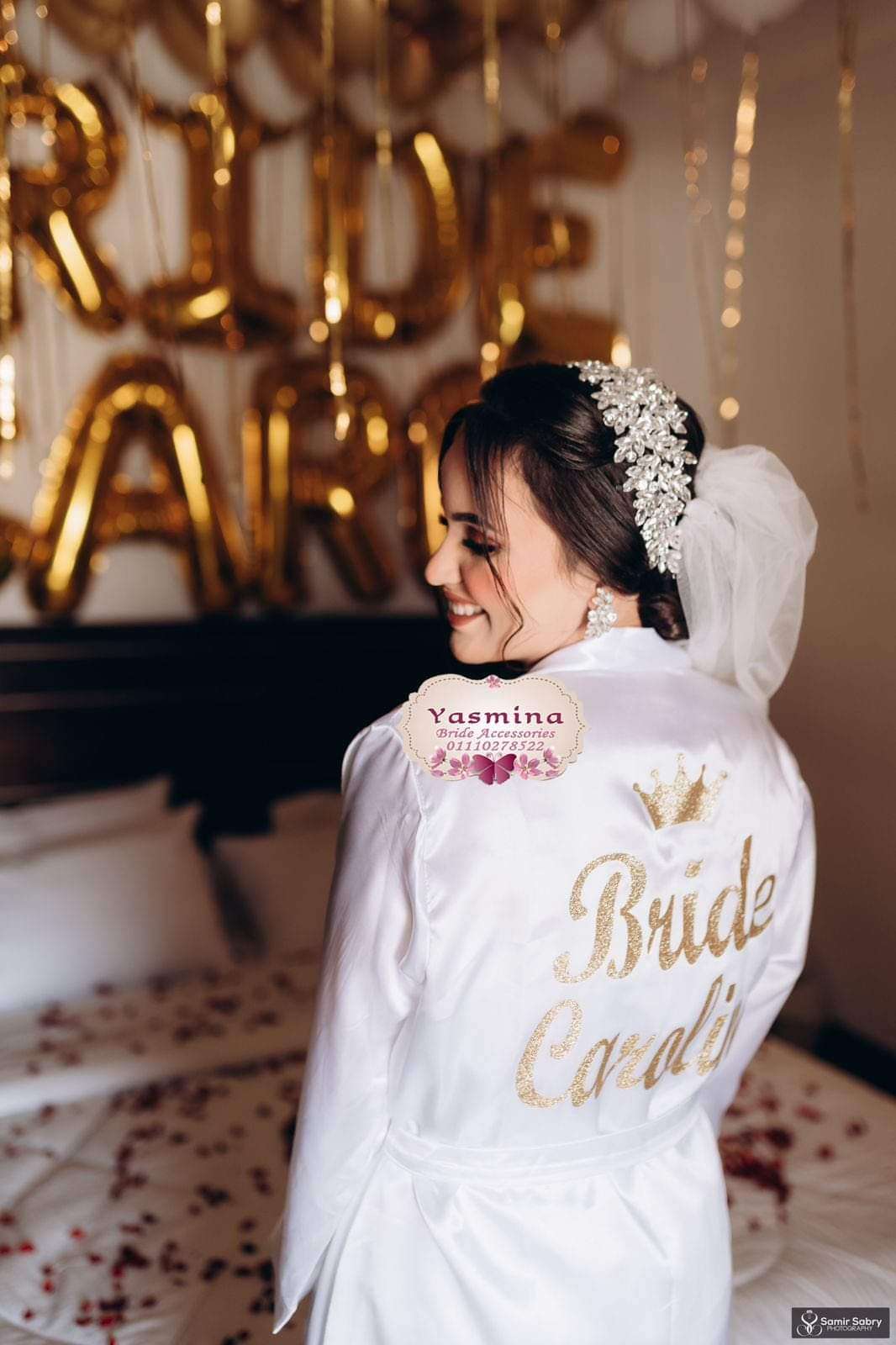 بيجامة عروسه مكونه من روب ابيض طباعه بنطلون ابيض توب طباعه