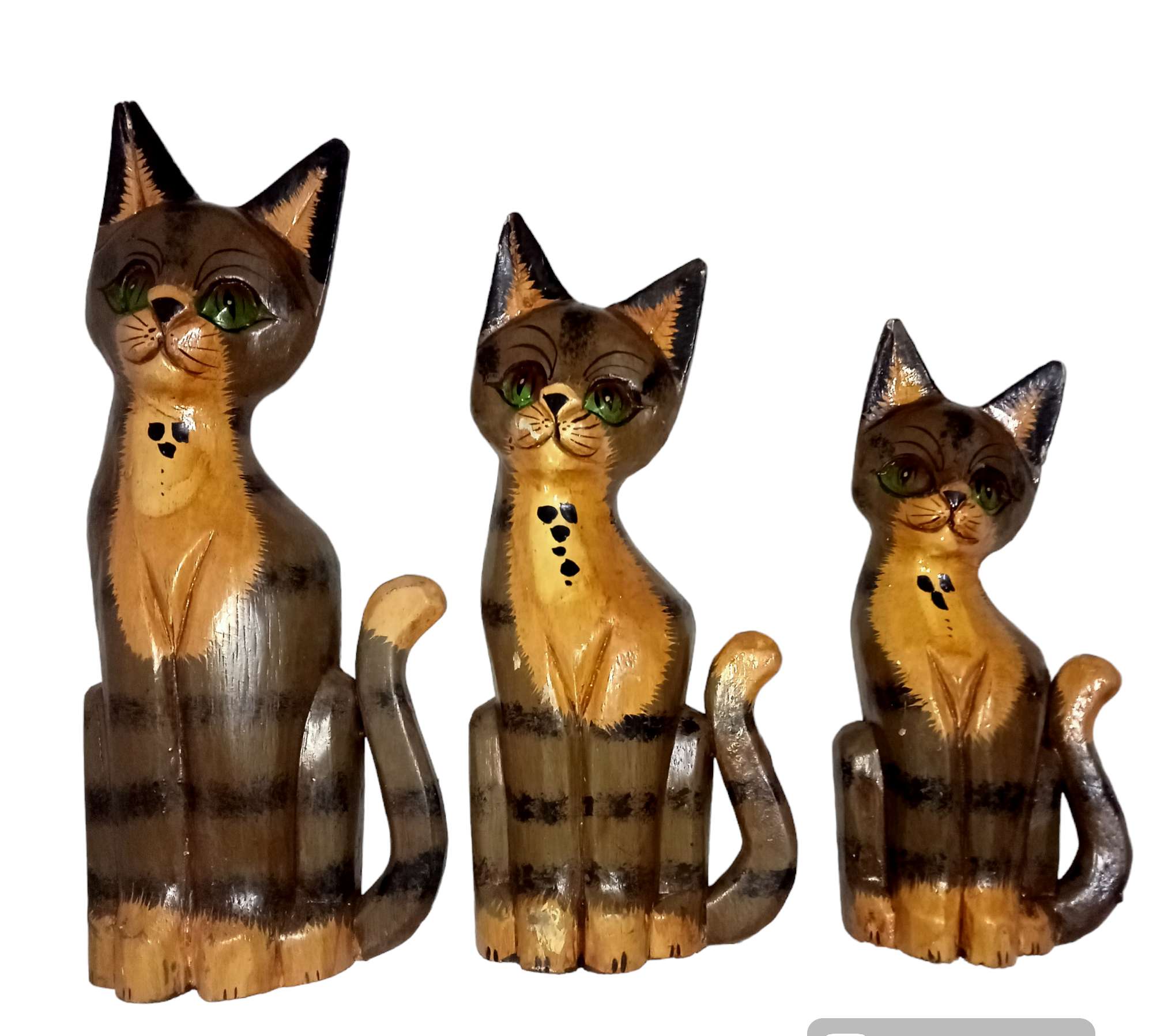 يوجد لدينا طقم قطط خشب اندونيسيي هاند ميد ألوان مختلفة ثلاث قطع مقاس ٢٠و٢٥و ٣٠سم منحوتة بدقه متناهيه تحفه رائعه