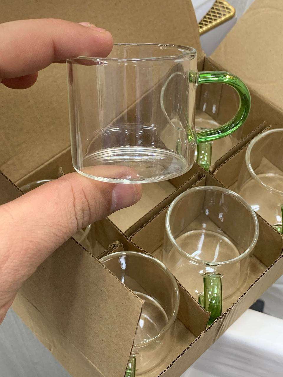 جديد ♥️ طقم فنجان قهوه 6 قطعه 👌🏻 يد ملونة اخضر 💚💚 بيريكس💚 حرارى 🔥 حوالي سعه 100 mll سعر الطقم ١٥٥