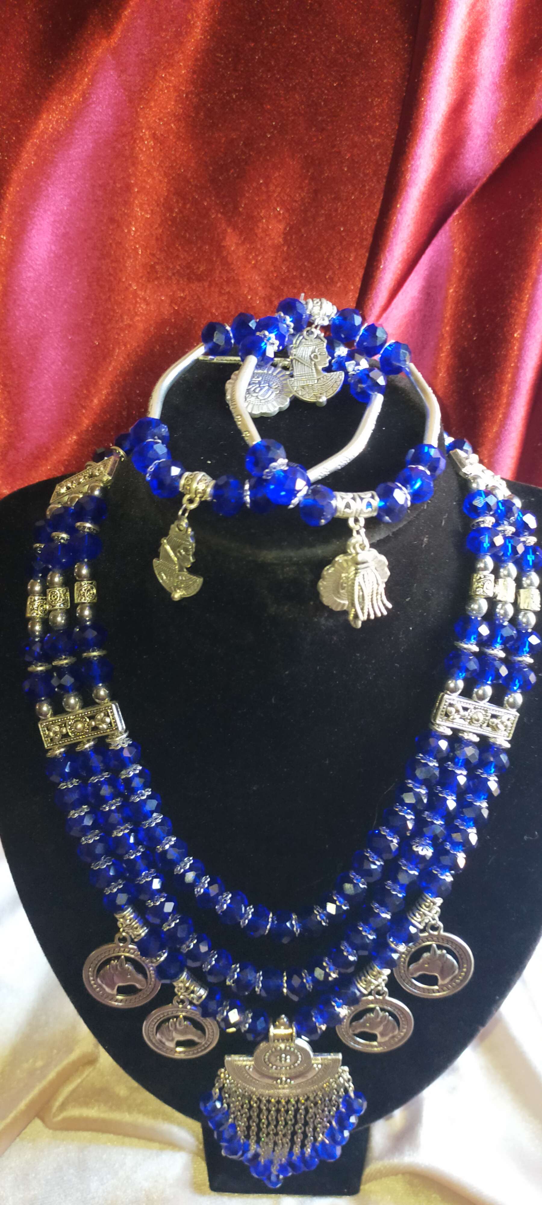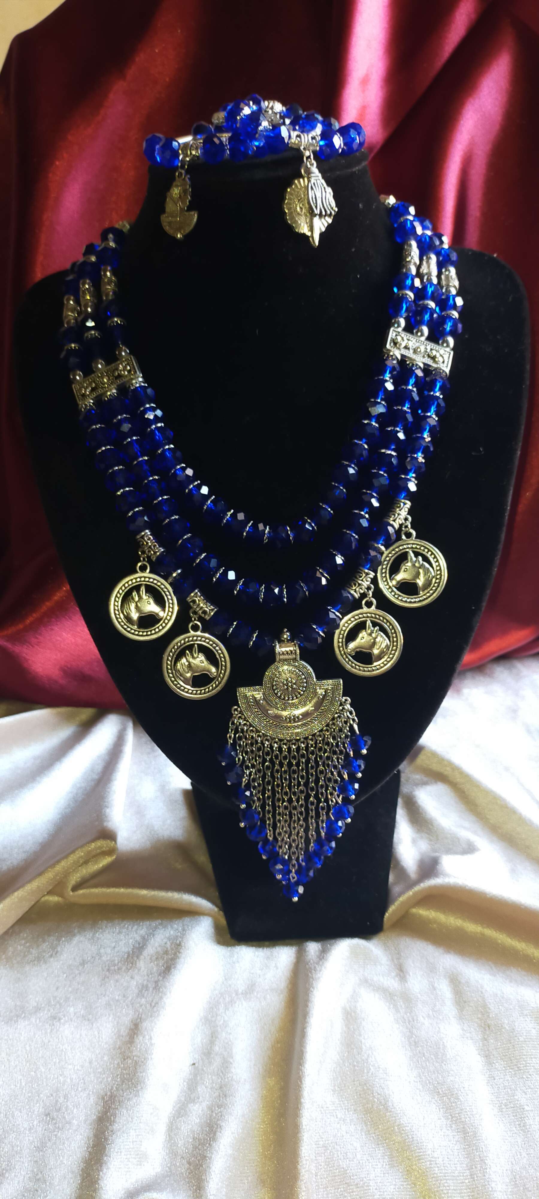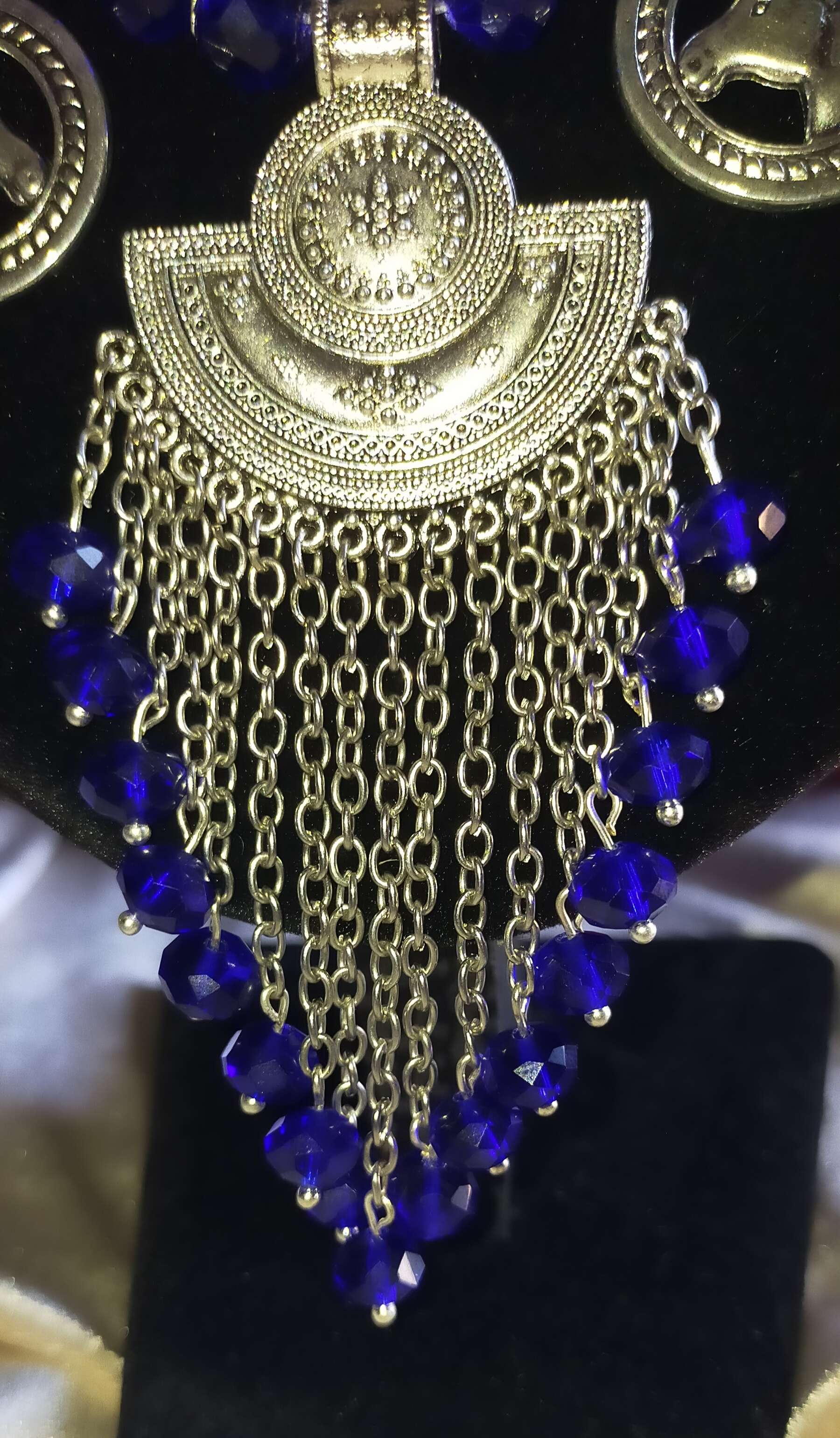 عقد من الكريستال الازرق بدلايات معدن لونها فضي واسورتين