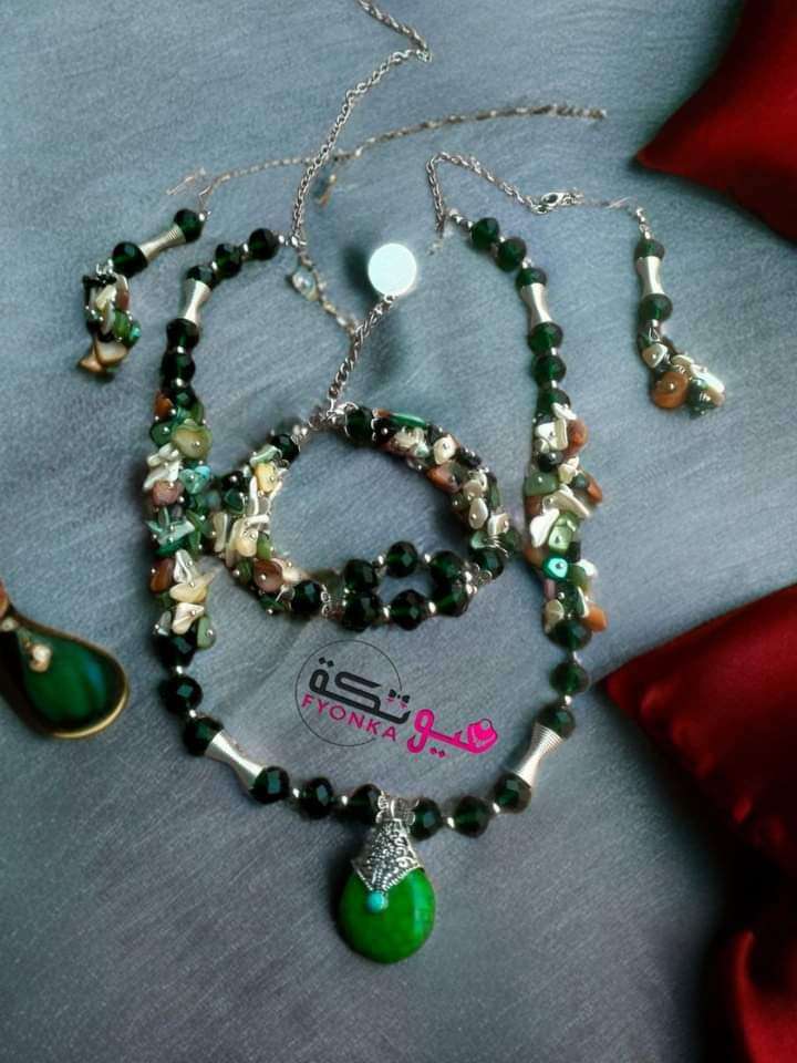 طقم مكون من عقد واسورة وحلق مصنوع من خرز الكريستال الاخضر وكسر الحجر