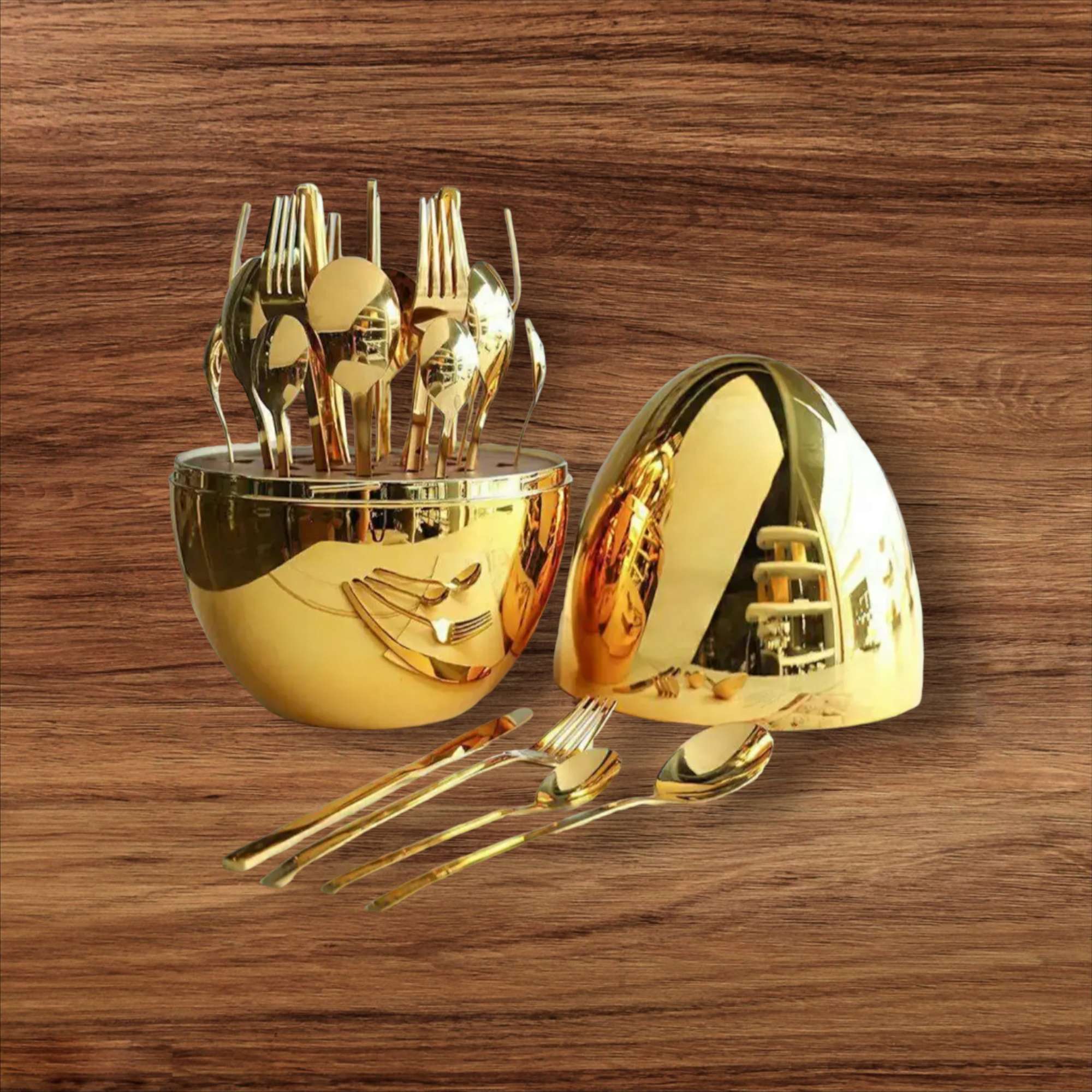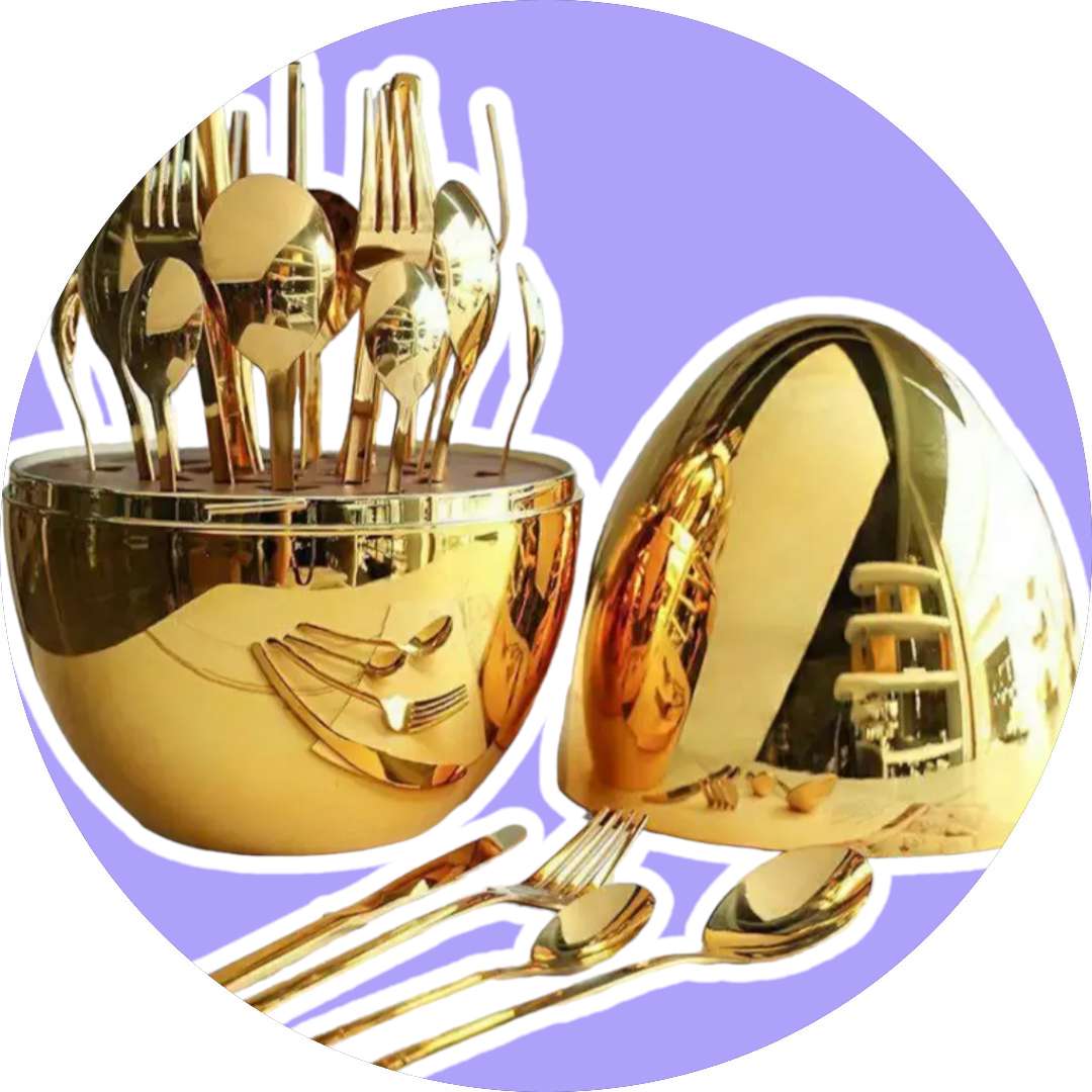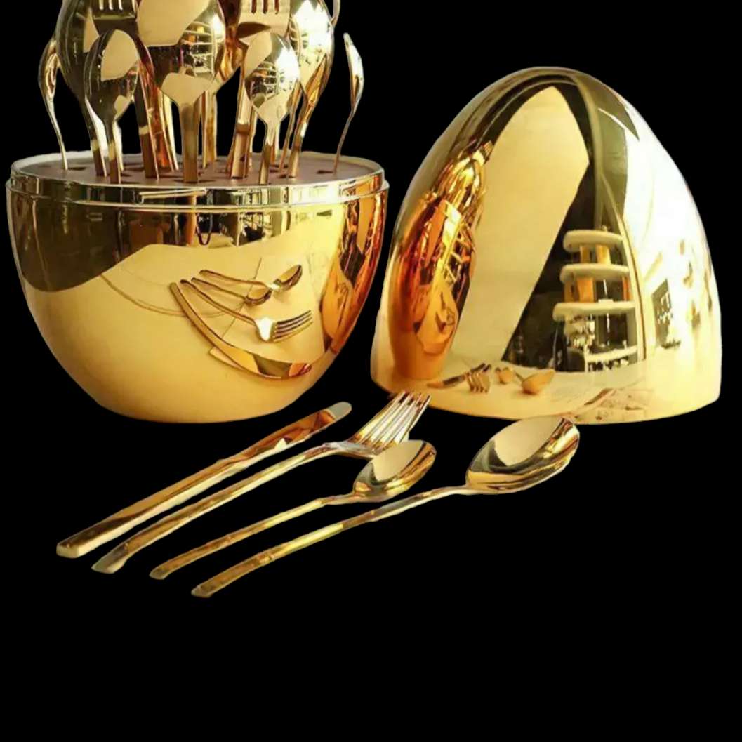 طقم ملاعق 27 قطعة ذهبى مكون من طقم ملاعق استانلس ستيل 24 قطعة مقسمة على 6 قطع من [ملعقة كبيرة-ملعقة صغيرة- شوكة كبيرة - شوكة صغيرة -سكينة] موضوعة في علبة على شكل بيضة ذهبية لامعة