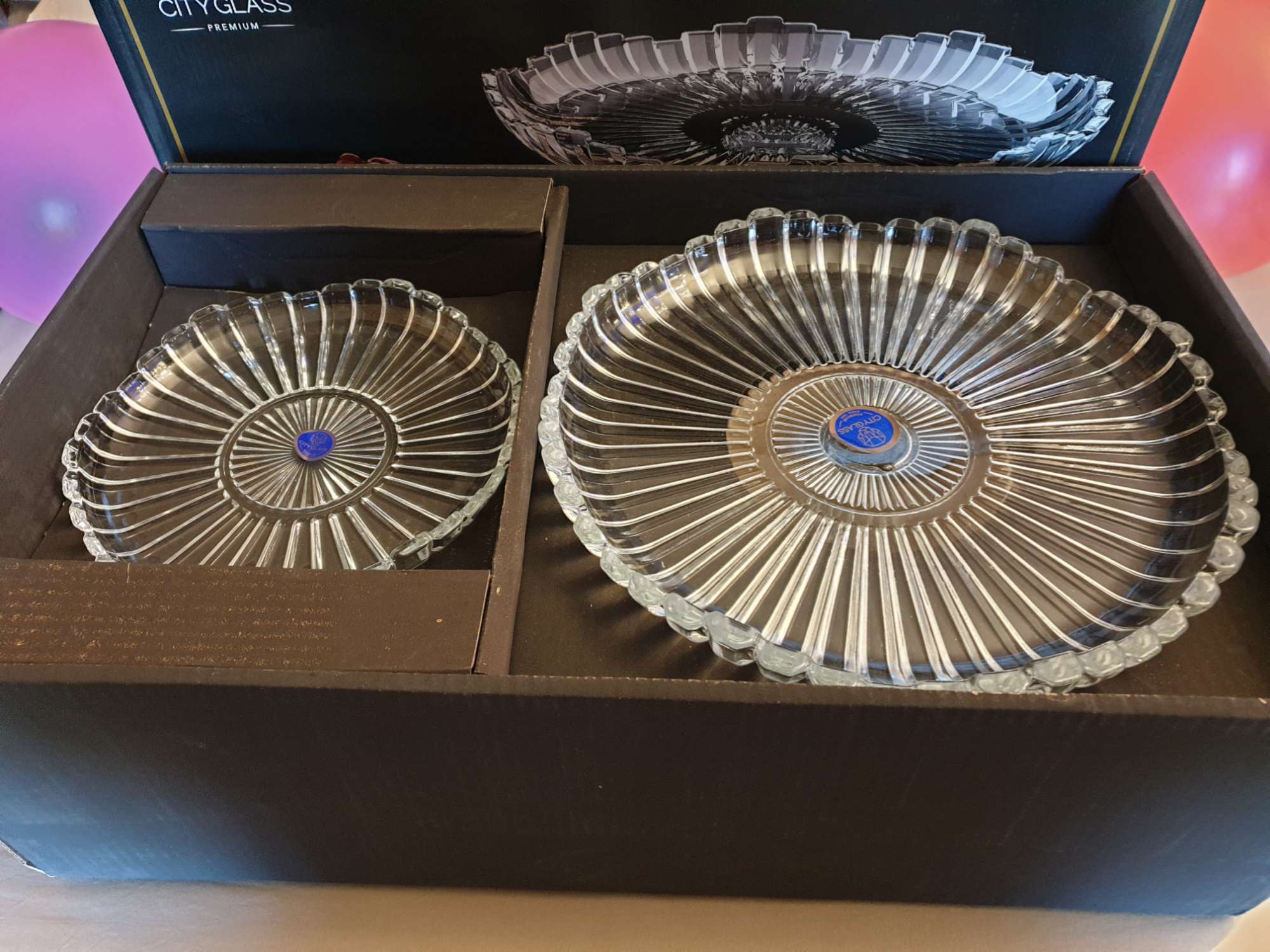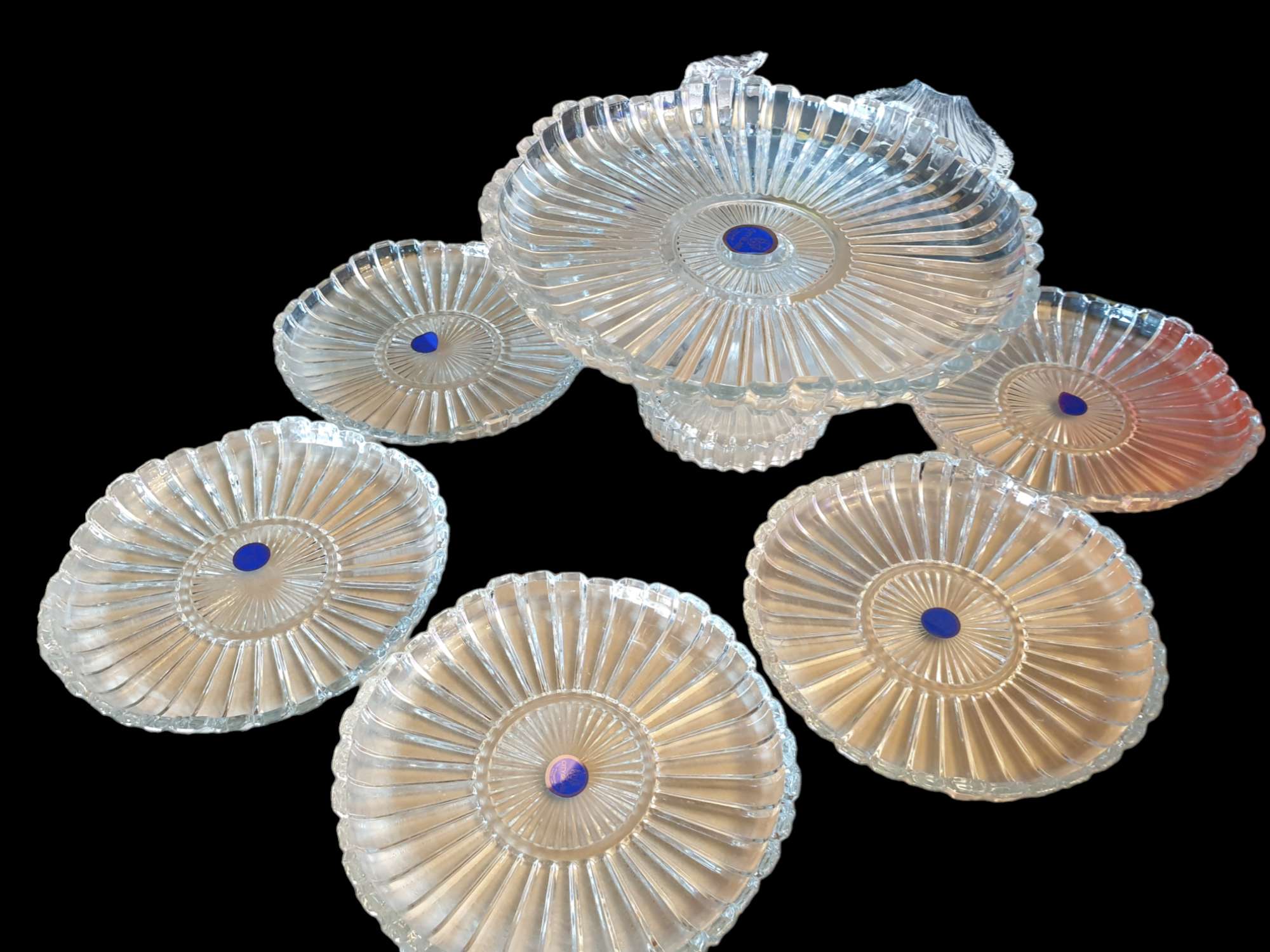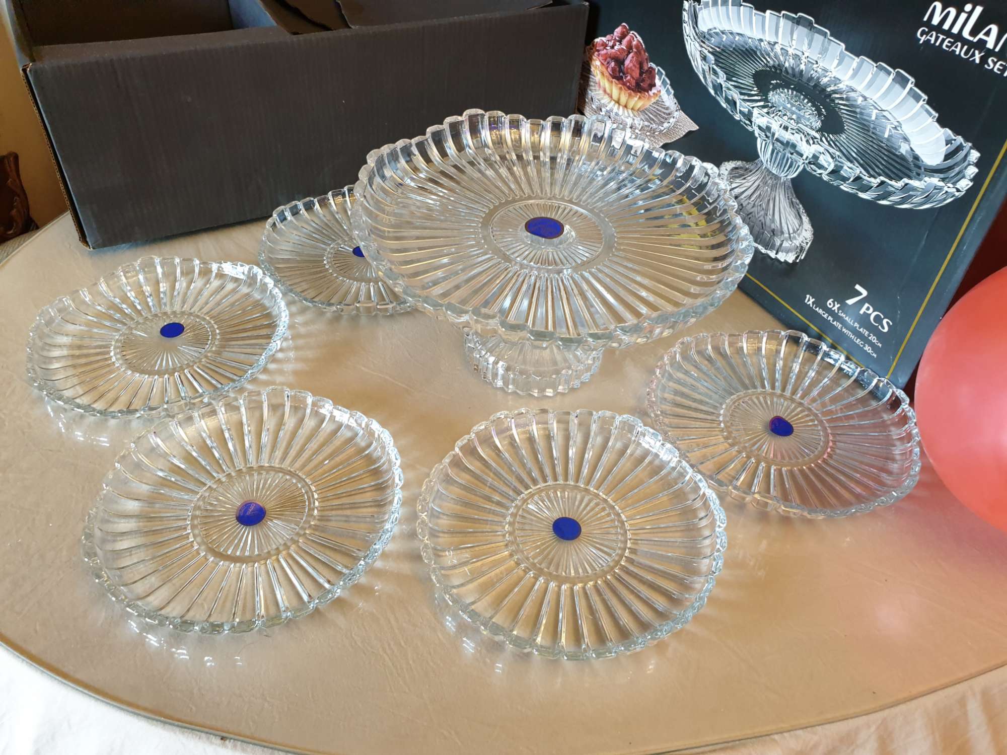 طقم التورتة يتكون من طبق تقديم التورتة بيد و6 اطباق تقديم