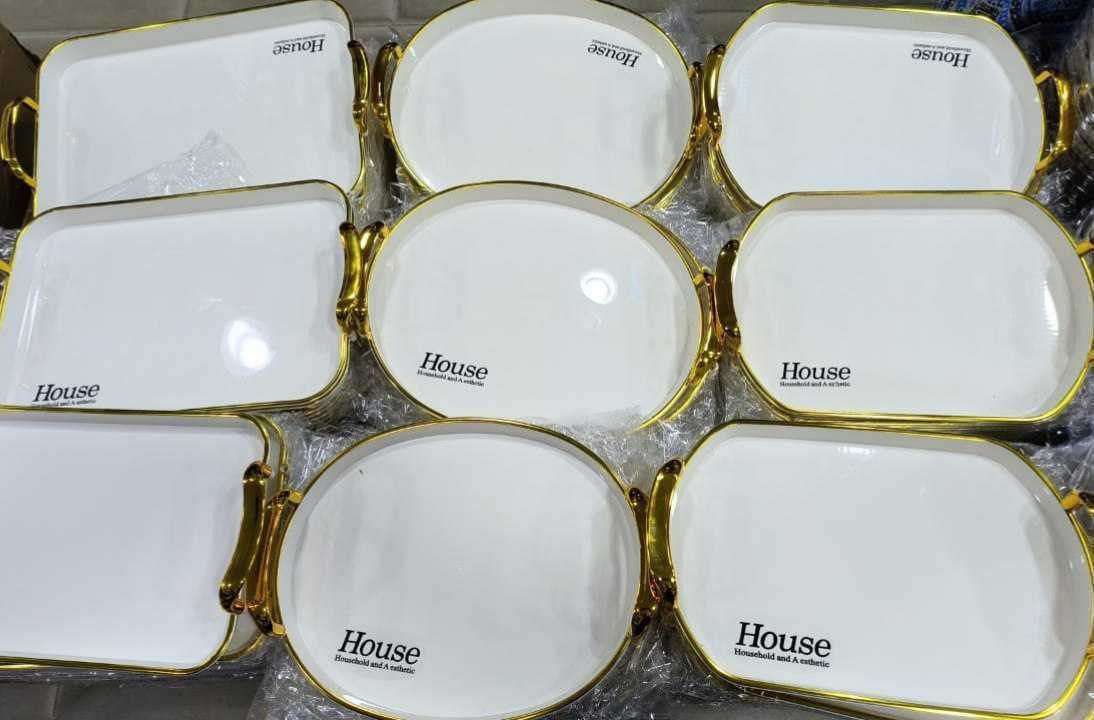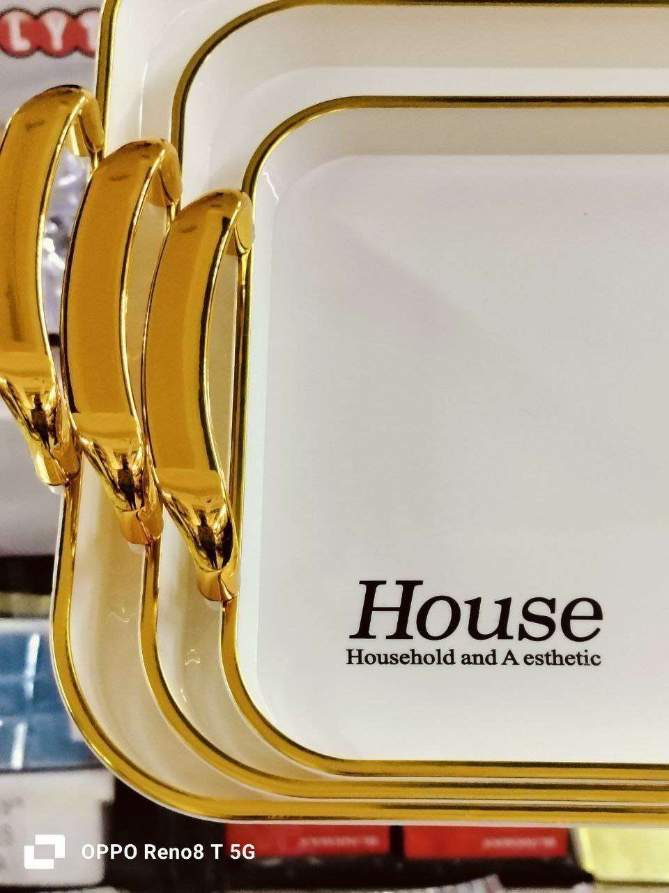 طقم صينيه ملامين ❤️ HOUSE إنسوا صواني التقديم اللي إتعودنا عليها خلاص 💚💚🔥 صينية تقديم ميلامين مطعمة بالجولد شيك جداً جداً مقبض دهبي غيرنا مفهوم الصواني صنيه تقديم ميلامين الغير قابل للكسر