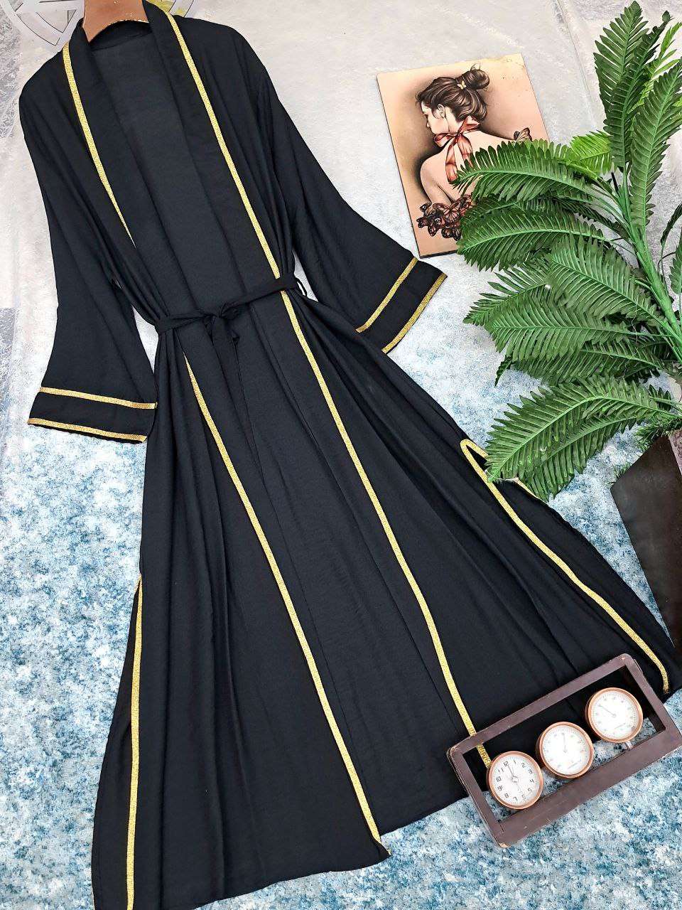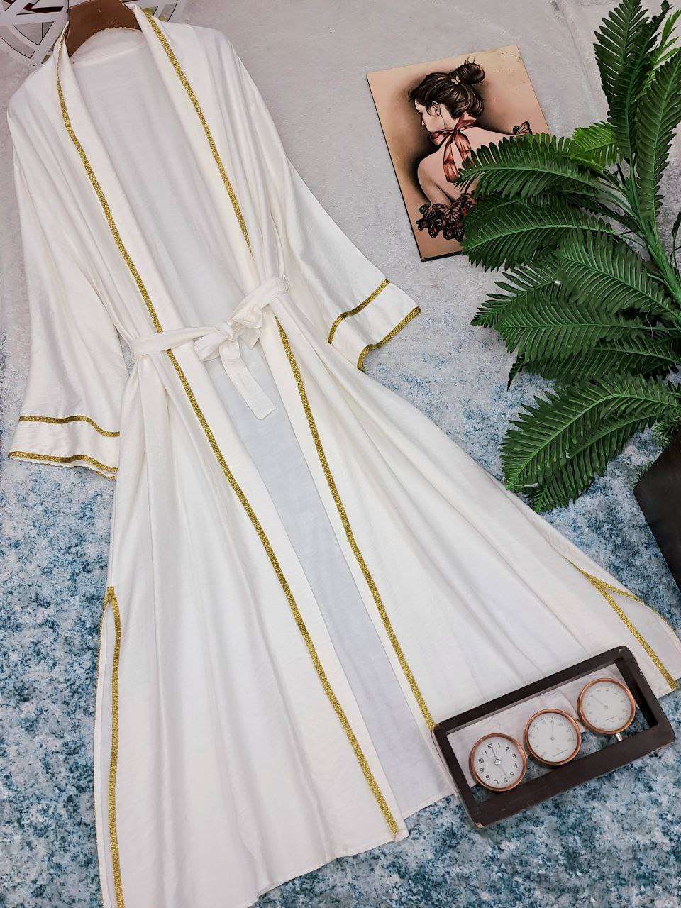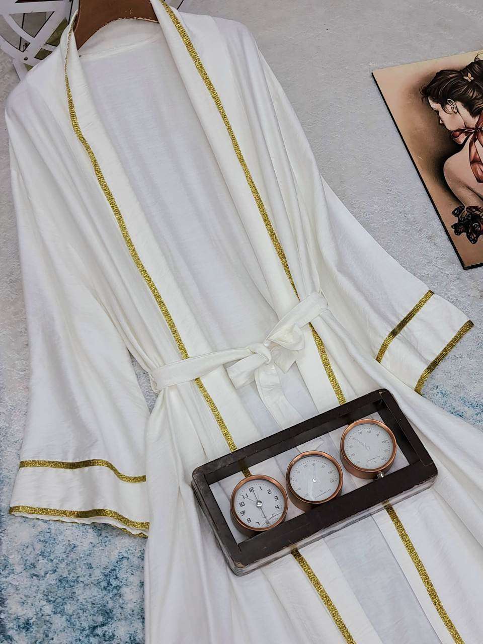 بورلو طويل بكنار مدهب اخر شياكه وحزام شيك.جداااا الخامه كتان عالي الجوده الطول 140cm يلبس ل 100k متاح الالوان بالعرض 😍😍😍
