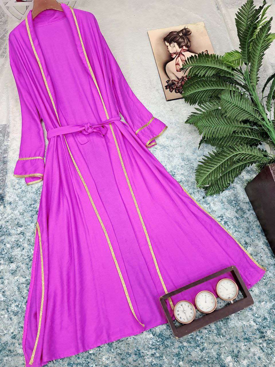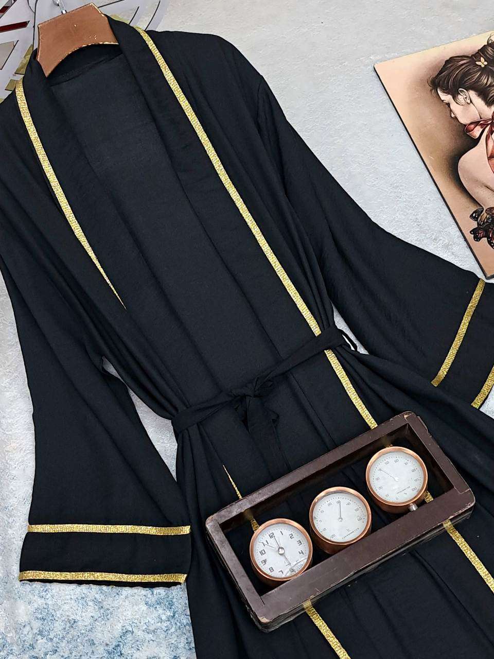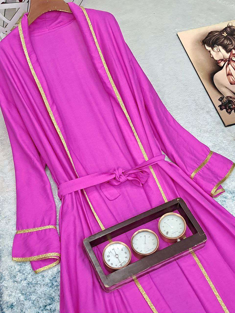 بورلو طويل بكنار مدهب اخر شياكه وحزام شيك.جداااا الخامه كتان عالي الجوده الطول 140cm يلبس ل 100k متاح الالوان بالعرض 😍😍😍