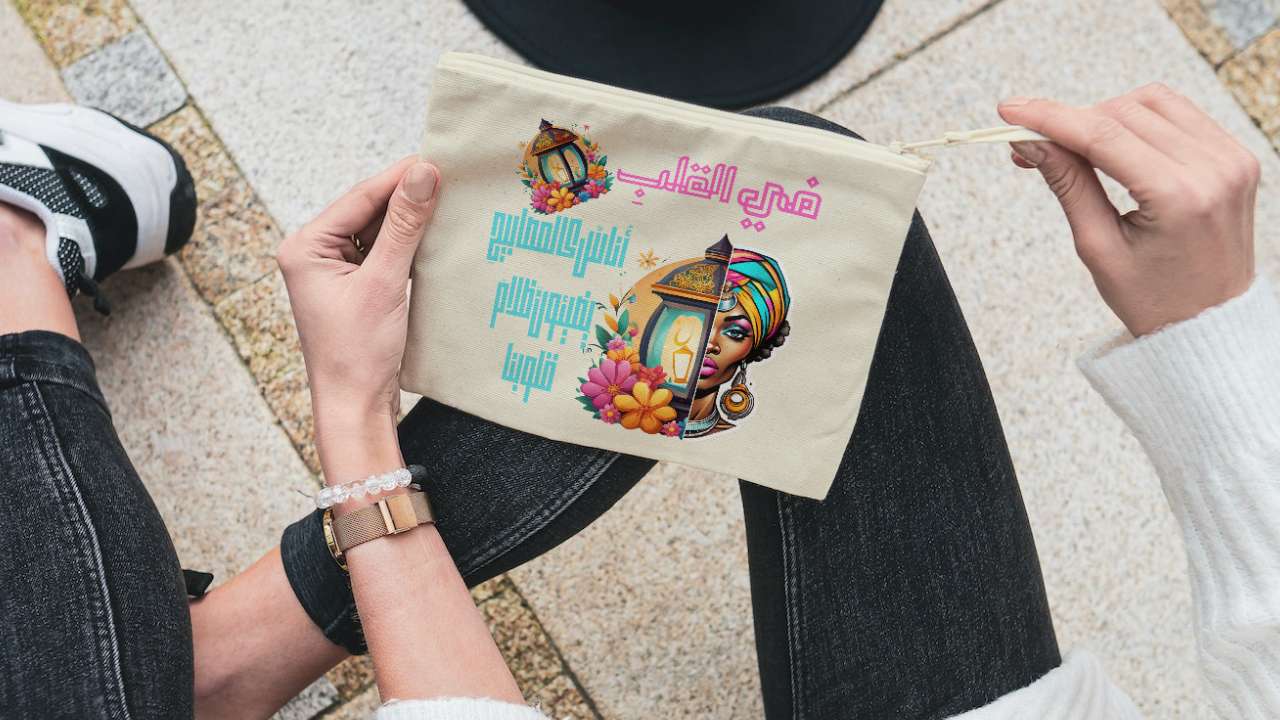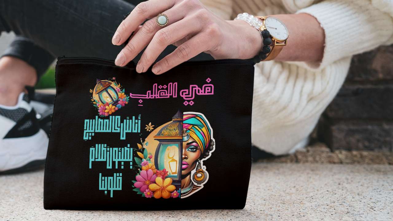 بُك - شنطة يد و مكياج- (Pouch) مصنوعة من أجود خامات _ امرأة سمراء ومصباح و زهور في القلب أناس كالمصابيحِ _ امرأة سمراء استمتعي بإطلالة مميزة بألوان مبهجة 🤩🌹مع بُك - شنطة يد - (Pouch) مصنوعة