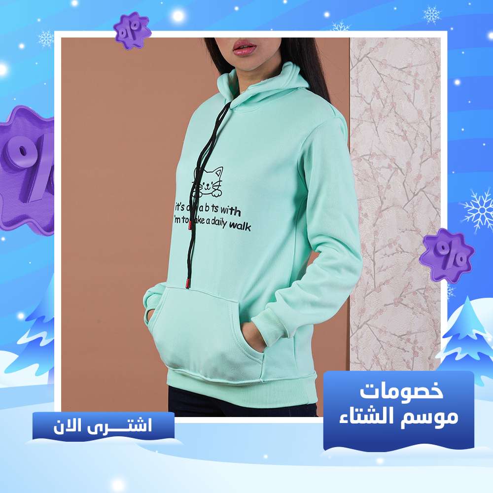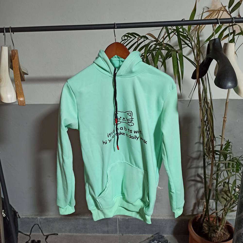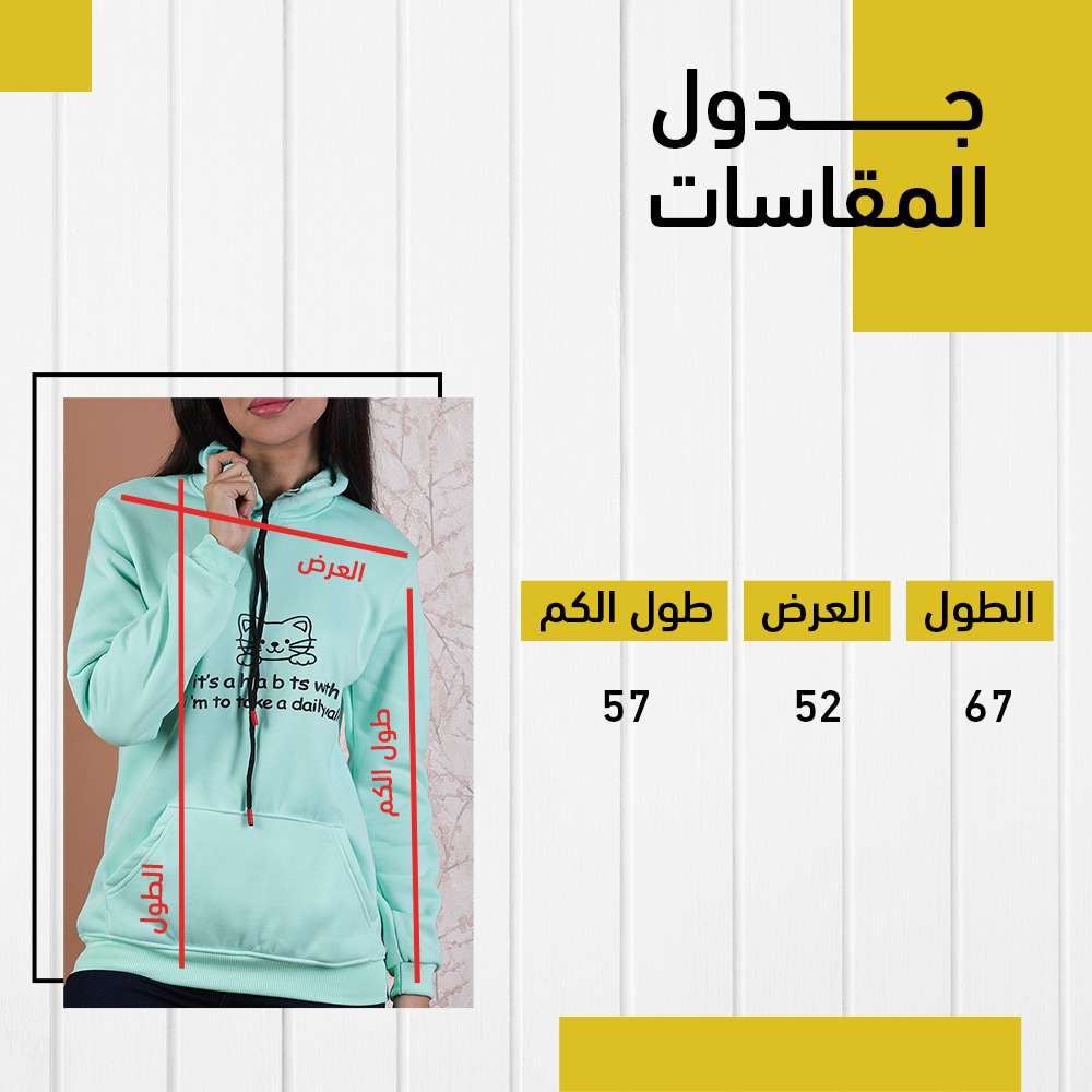• *تفاصيل* • الموديل:سويت شيرت CAT • الخامة: ميلتون مبطن • اللون: مينت جرين • جيب واسع • كابيشو • أكمام بسوار • *مقاسات* • وان سايز • يلبس من 50 كيلو الى 70 كيلو • الابعاد: (الطول 67، العرض