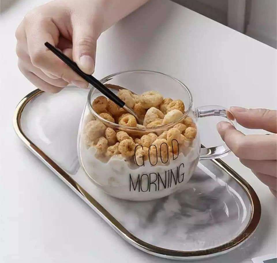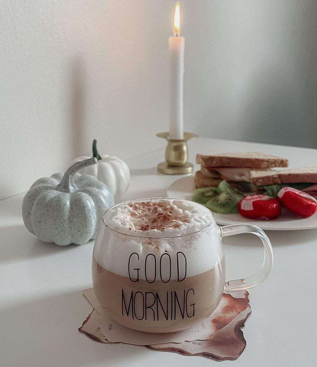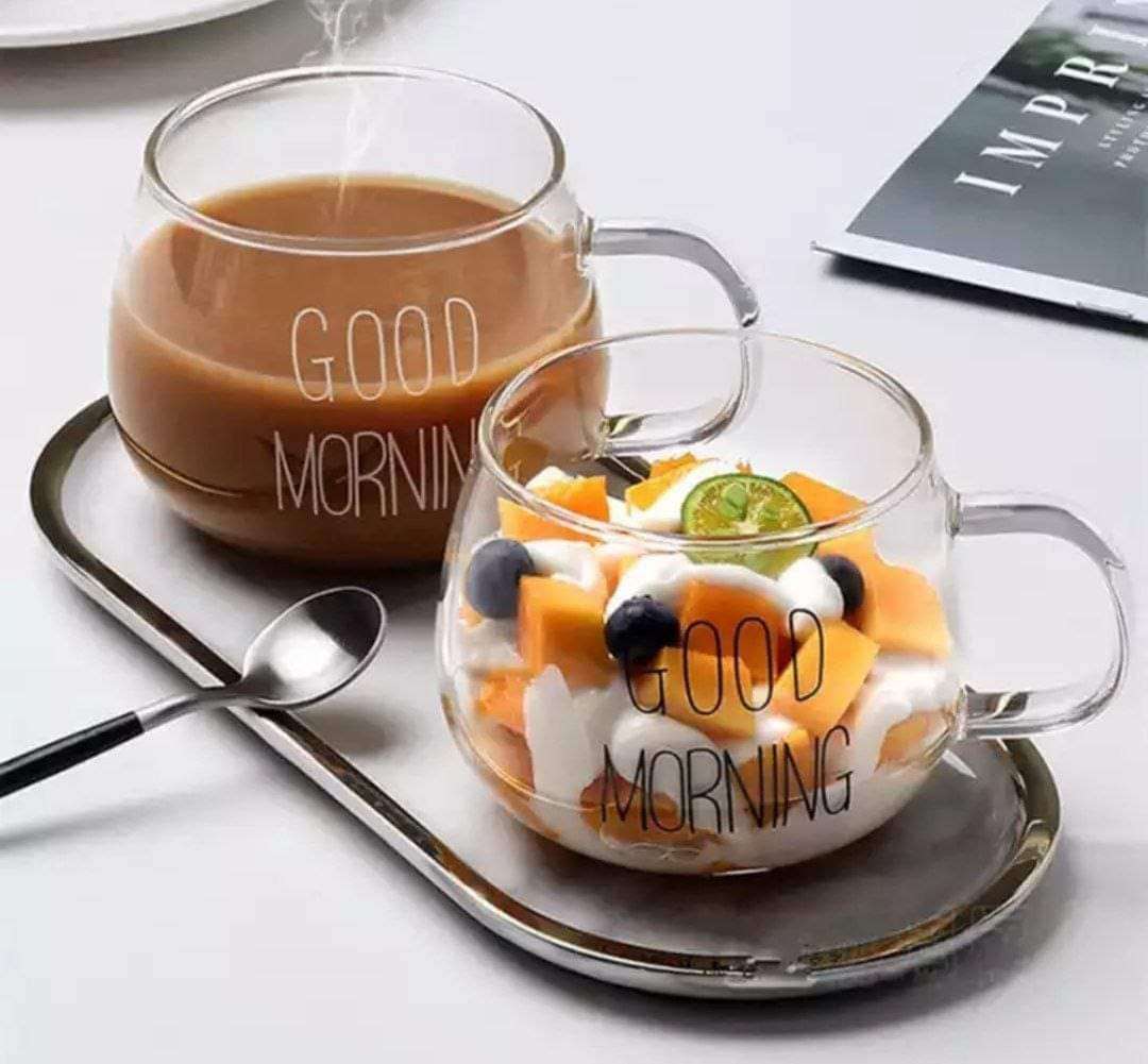 مج الكابتشينو التريند ❤️❤️❤️ GOOD MORNING☕ المستورد شكل بيضاوي سعه 380 مللي مج بايركس زجاج مستورد..بيتحمل الحراره والبروده..يستخدم علي النار مباشرة🔥