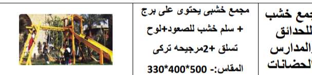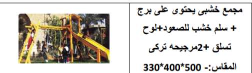 مجمع خشبي يحتوي على برج+سلم خشبي للصعود+لوح للتسلق+2مرجيحه تركي المقاس 500*400*330