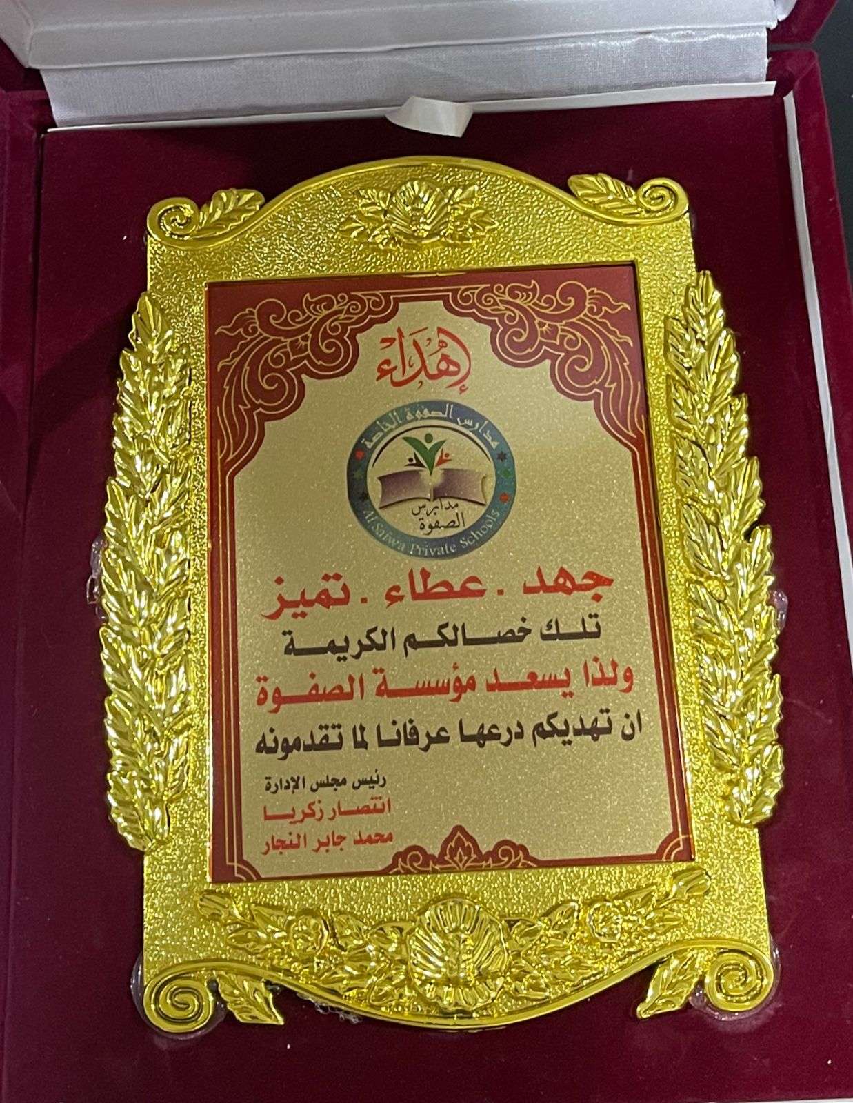 درع تكريم قطيفة طباعة على شيت معدن و ليس استيكر محاط بفريم ذهبي او فضي حسب لون الشيت خامة ثقيلة و ليست مثل خامات السوق