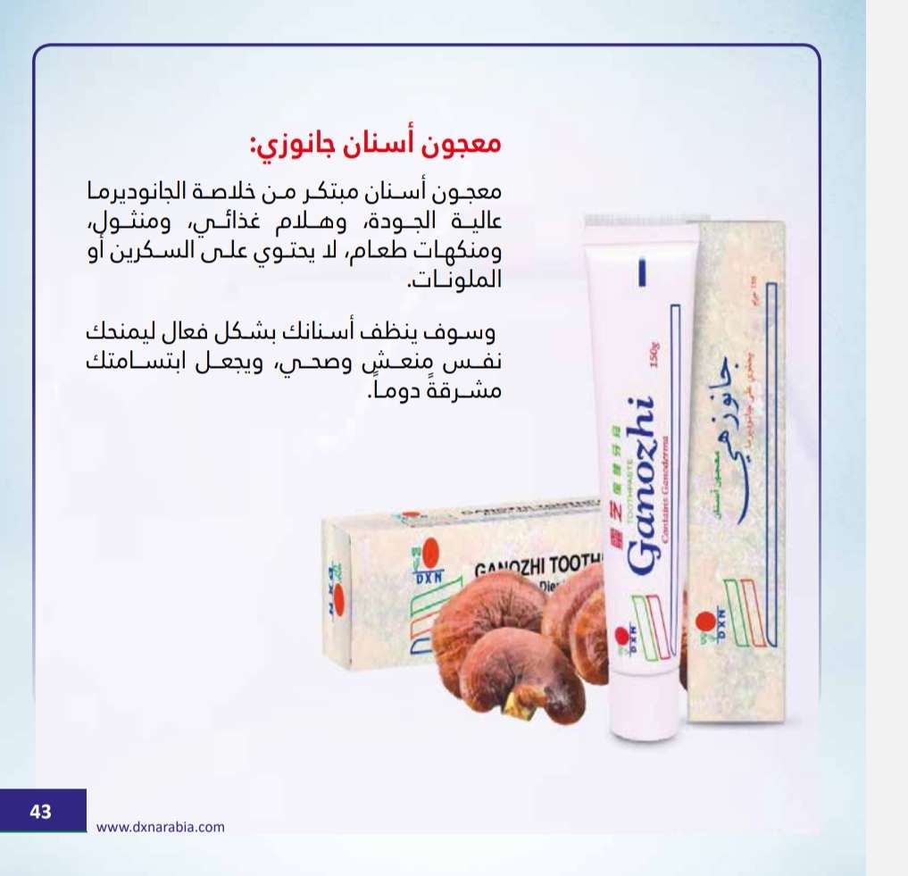 معجون أسنان جانوزي: معجــون أســنان مبتكــر مــن خالصــة الجانوديرمــا عاليـــة الجـــودة، وهـــام غذائـــي، ومنثـــول، ومنكهــات طعــام، ال يحتــوي علــى الســكرين أو الملونـــات. وسـوف ينظف