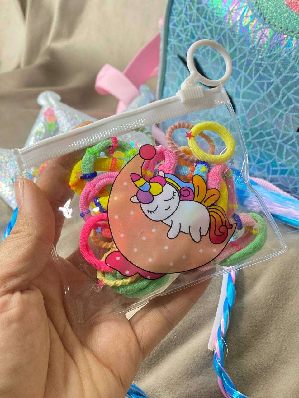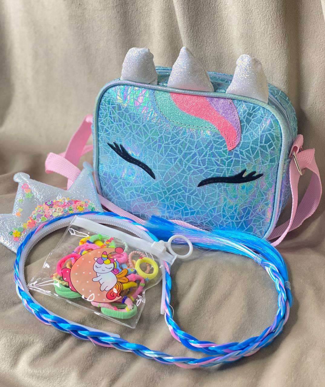 طقم بناتي خطييييير ♥️ مكون من من اهم الحاجات اللي الاطفال بيحبوهم وبيغرحوا بيهم ❤️ 💜 اولا ☝️شنطه يوني كورن مستورده حجم ممتاز. جليتر بتلمع تشيل حاجات كتير الاصليه ماتريال فوق فوق الممتازه