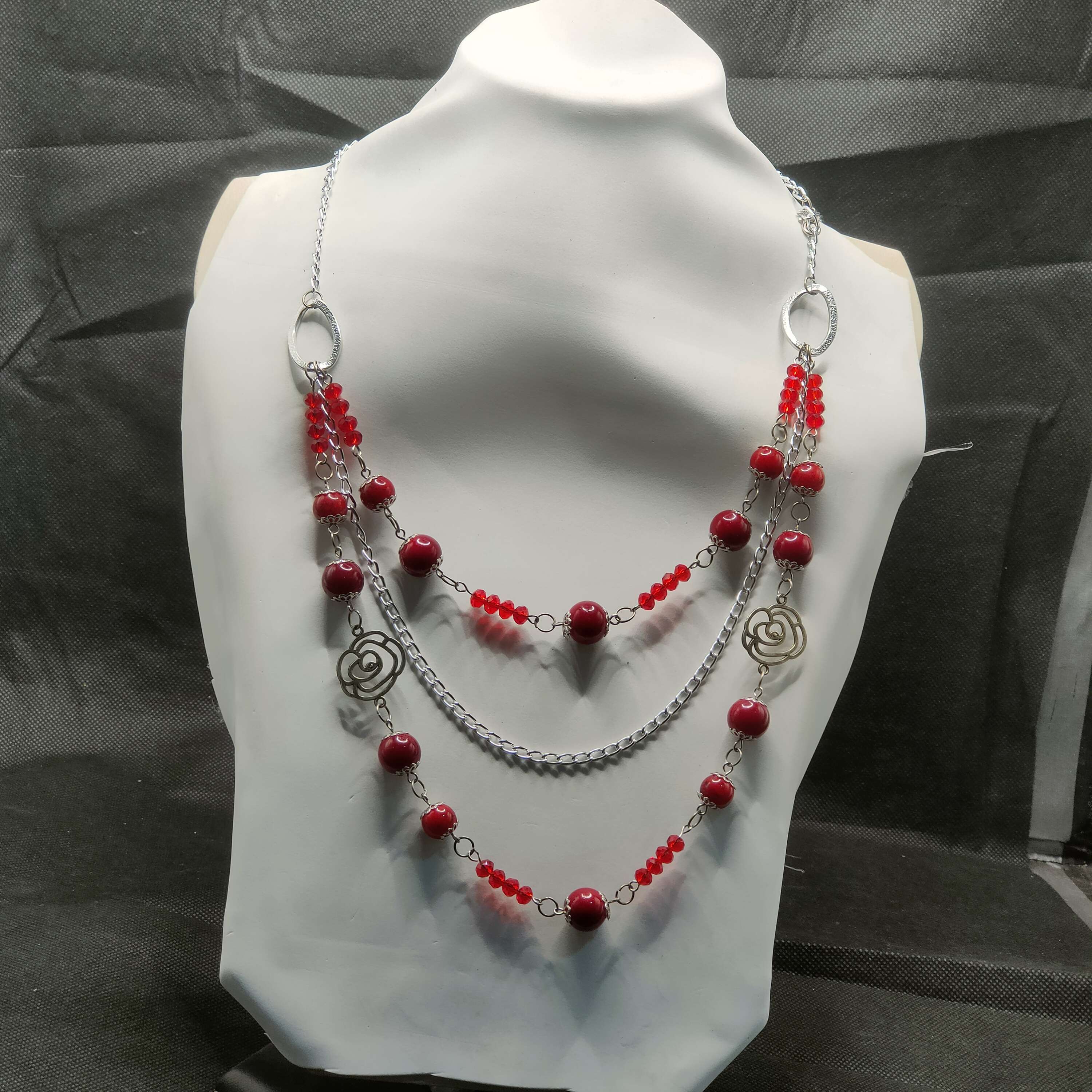 عقد بسيط من الخرز الكريستال الاحمر و السلاسل يصلح للصباح