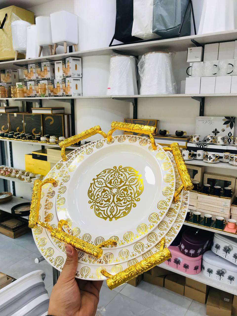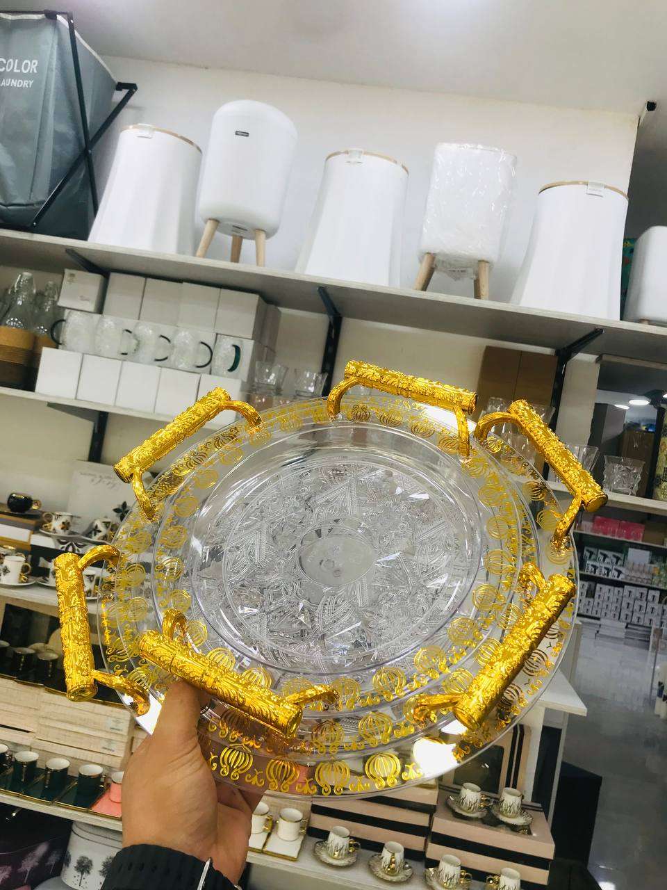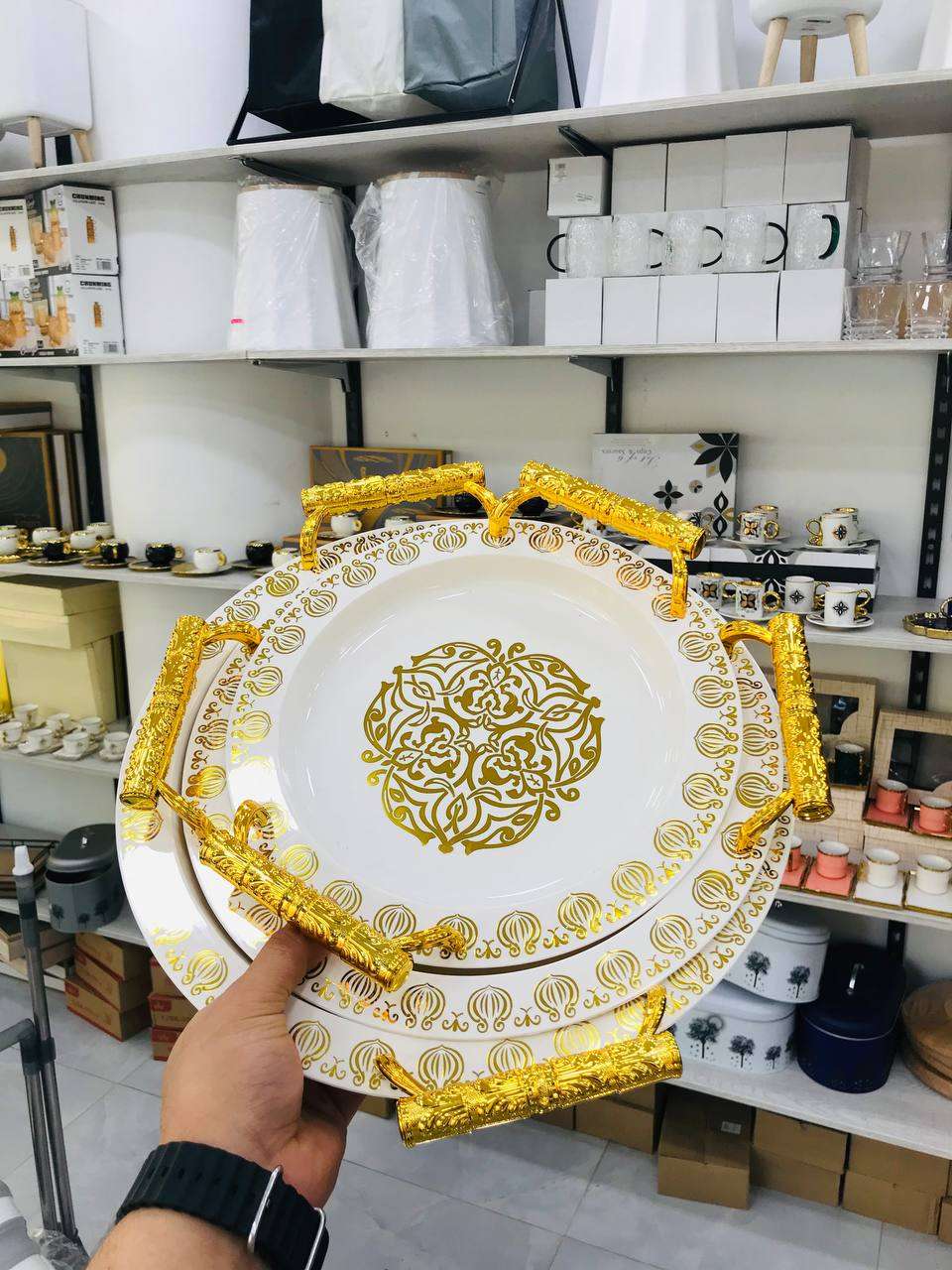 مطعمة باليد السيلفر او الجولد شيك جداً صنيه تقديم بلاستيك شكل ميلامين الغير قابل للكسر 🙈 الطقم 3 قطع..خاامة عالية الجودة👌