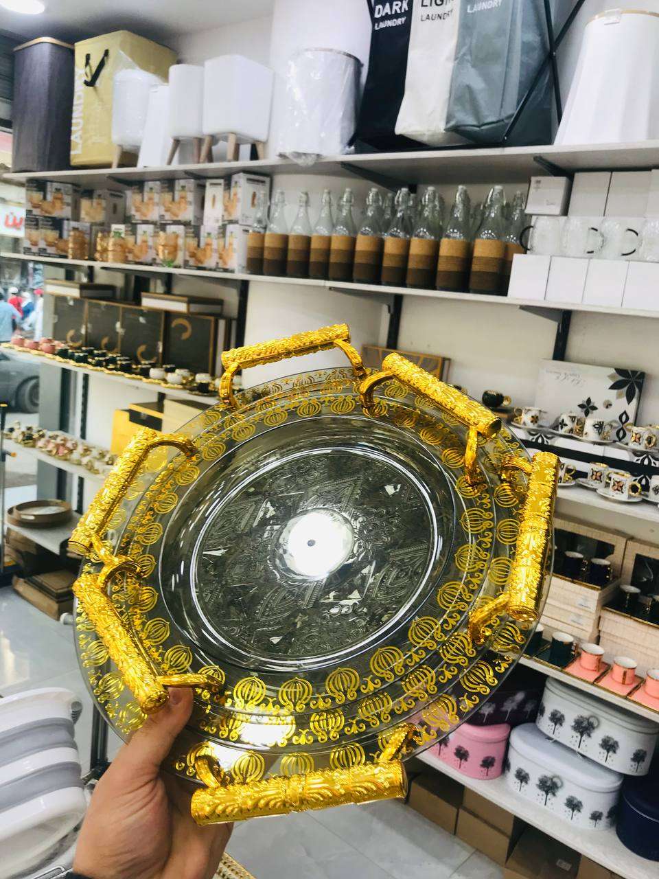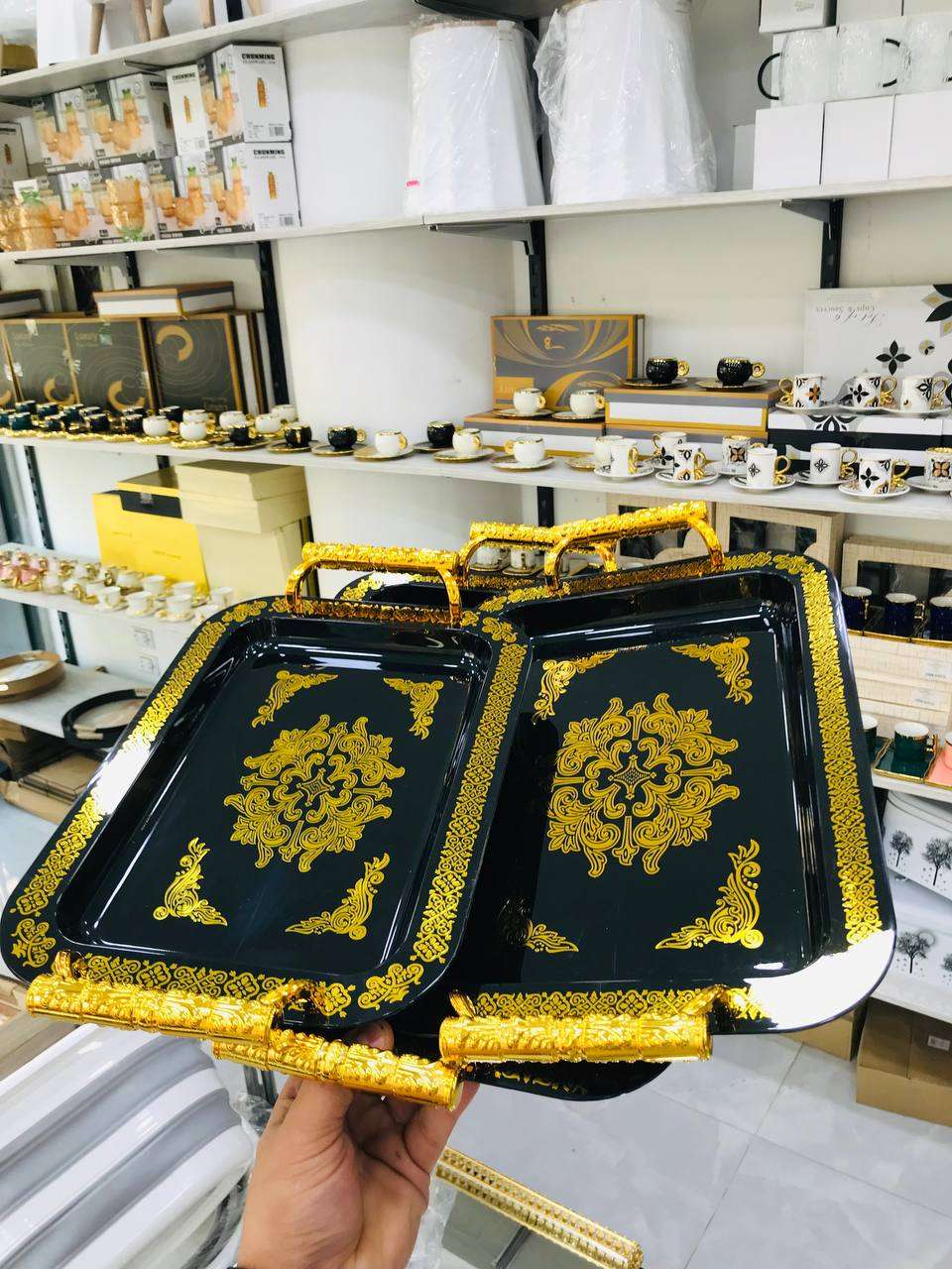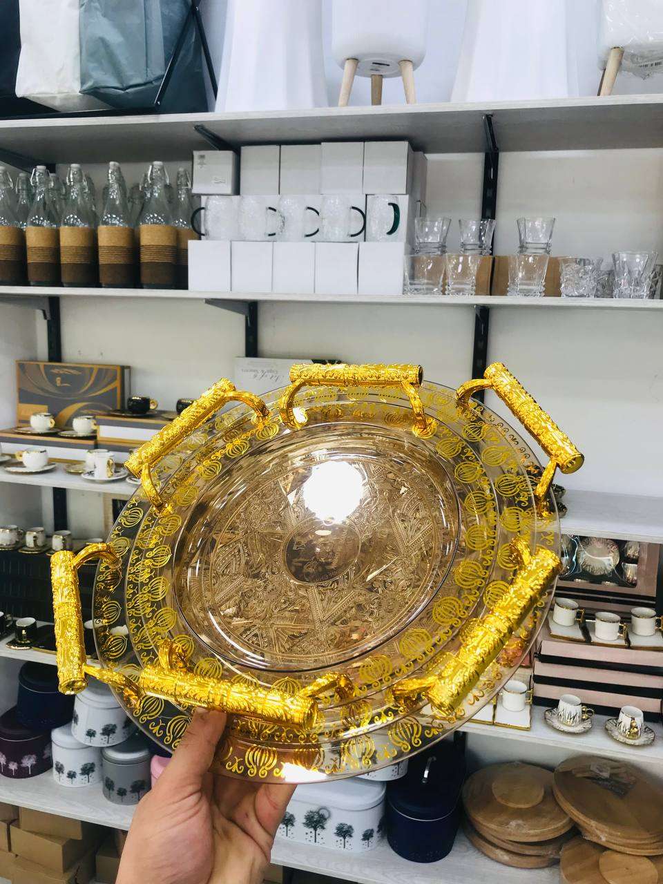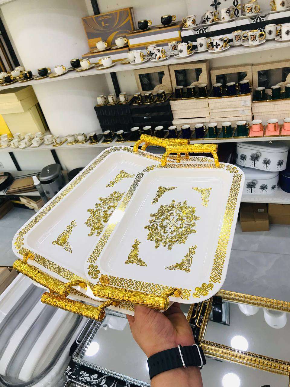 مطعمة باليد السيلفر او الجولد شيك جداً صنيه تقديم بلاستيك شكل ميلامين الغير قابل للكسر 🙈 الطقم 3 قطع..خاامة عالية الجودة👌