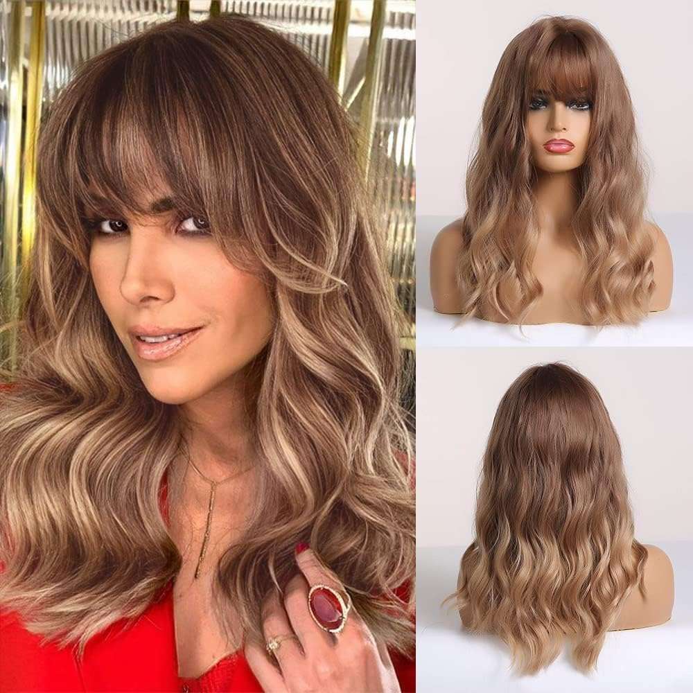 باروكة شعر متوسط الطول بني اللون مموج قابل للغسيل والمكواه