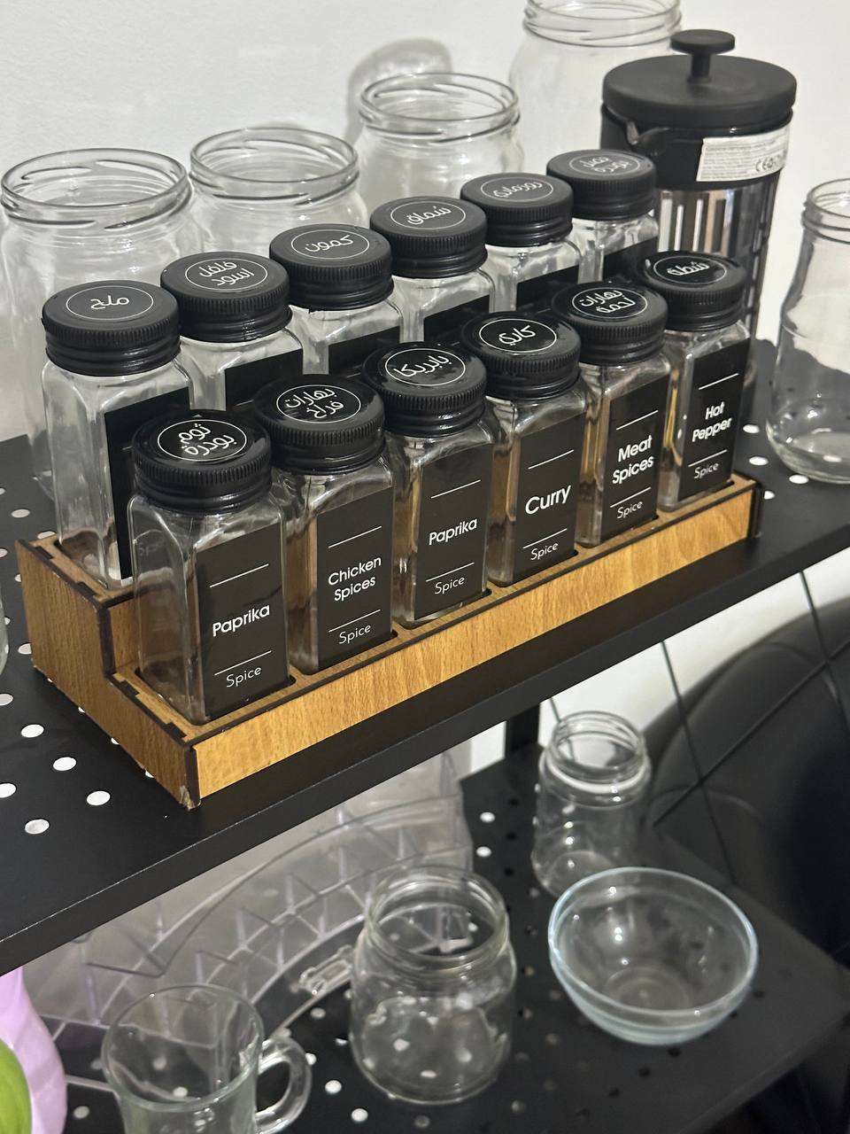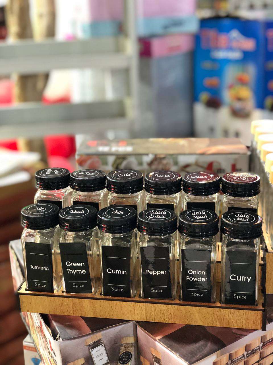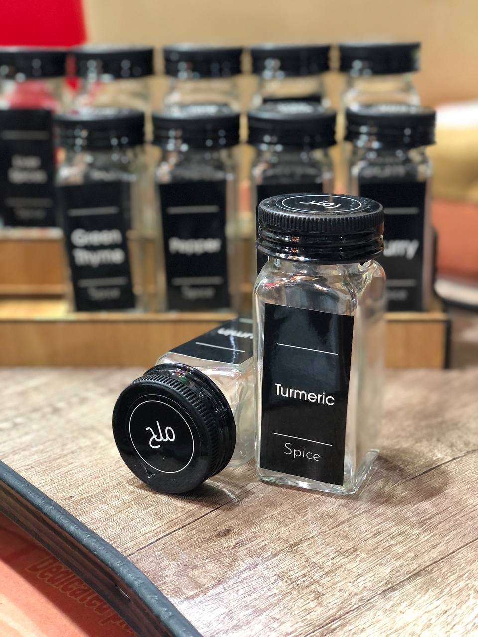 طقم توابل 12 قطعه+ ومعاه استاند خشب 12 قطعة كما في الصوره زجاج شفاف نقى 👌و معاها 24قطعه استيكر مدورعربي هديه + و12قطعه استيكر مستطيل انجليزي كما هو في الصورة ❤ مقاسات 👇👇👇 سعه البرطمان 120
