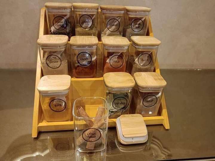 طقم توابل 12برطمان زجاج 200مللي + سلم خشب + استيكر توابل هديه برطمان زجاج بيركس نقي مستورد بغطاء خشب بامبو ( قابل للغسيل ) بجوان سيليكون محكم الغلق 💥
