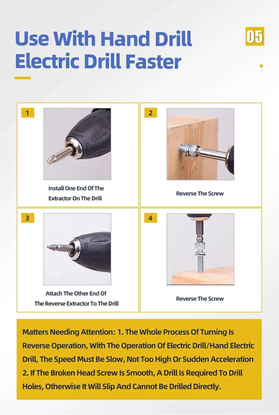 الوصف: تعمل مجموعة استخراج البراغي المكونة من 6 قطع مع أي مثقاب وأي حجم برغي أو براغي، رائعة لإزالة البراغي أو المكسورة أو العالقة أو التالفة أو المسمار. مزيل البراغي - يزيل أي برغي مجرد في 10 ثوانٍ أ