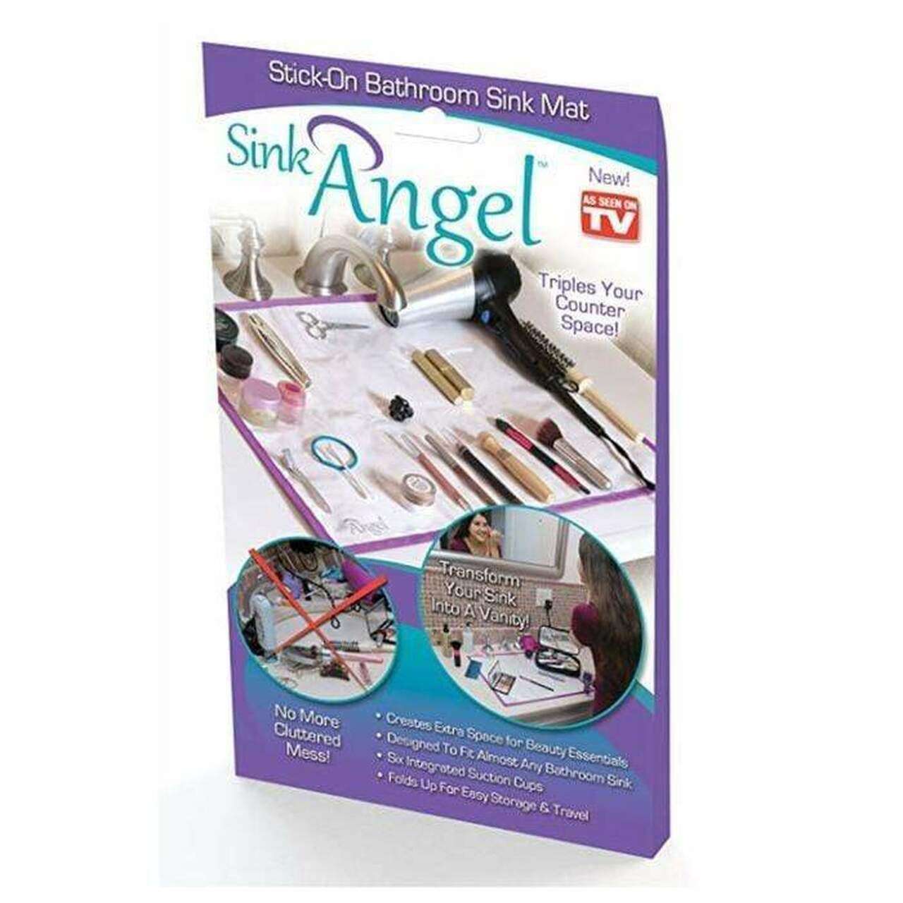 Sink Angel عبارة عن سجادة قابلة للالتصاق بالشفط يمكن وضعها فوق أي حوض لتوفير مساحة أكبر للحمام. يمكن للسجادة أن تستوعب أي عدد من الأشياء بما في ذلك فرش الأسنان ، والفرشاة ، ومجففات الشعر ، والمرايا ،
