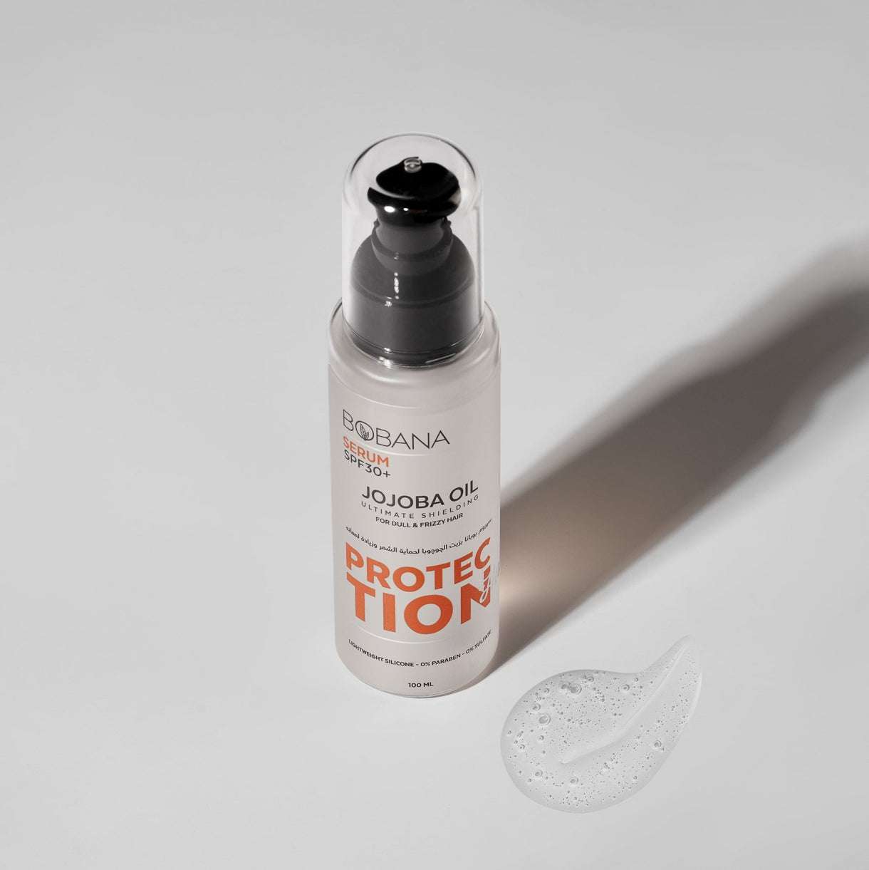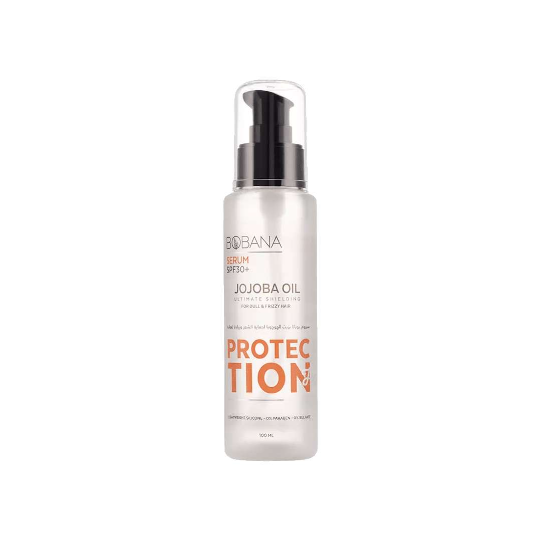 تركيبة حماية إضافية من بوبانا غنية بزيت الجوجوبا تعمل على إصلاح الأطراف المتقصفة وتعمل كدرع للشعر ضد حرارة التصفيف الضارة وأضرار الأشعة فوق البنفسجية، مما يوفر حماية للشعر بعامل حماية من الشمس SPF 30+