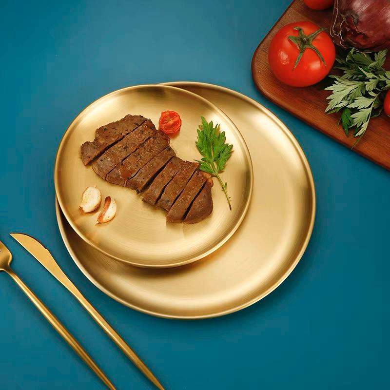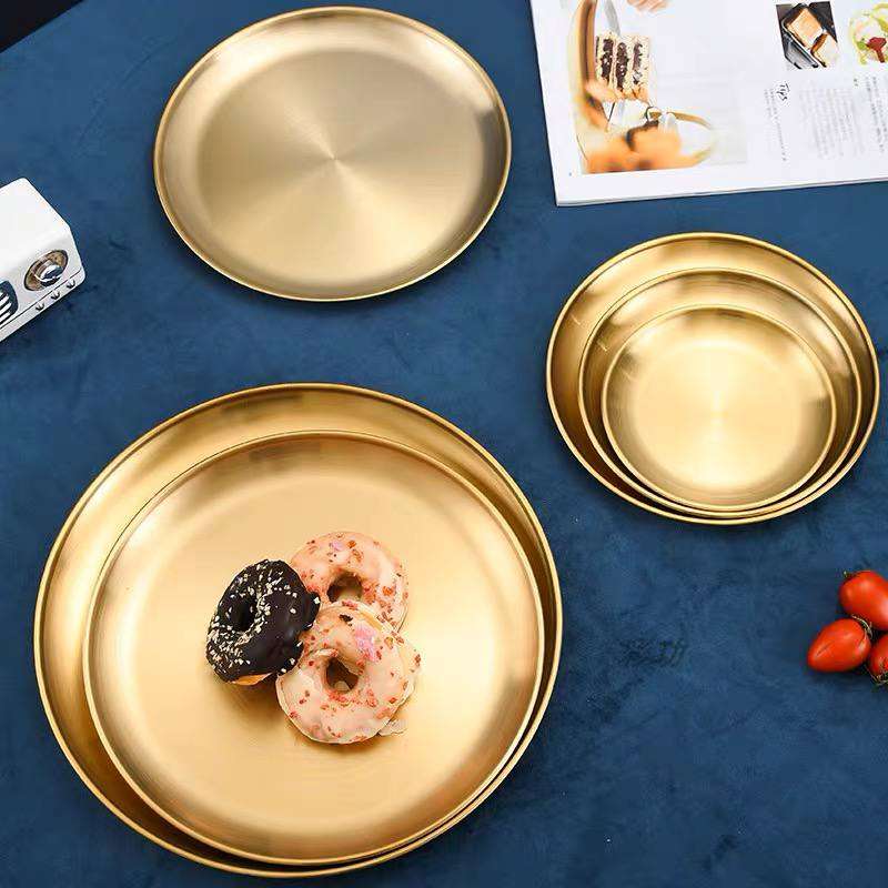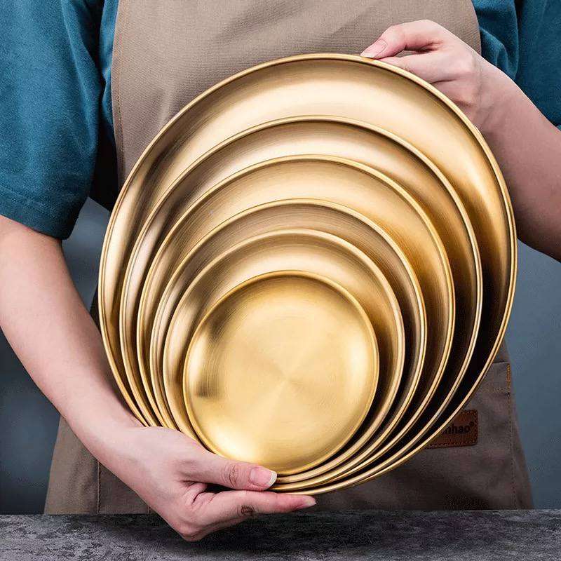 اطباق استانلس مدهبة للتقديم 😉✨ أطباق عشاء ذهبية من الفولاذ المقاوم للصدأ ، أطباق تقديم ، صينية كعك دائرية ، أطباق ستيك غربية 🥩🥓🥪 ، مختلفة الحجم ، تستخدم في المنزل 🍰🧁🥩🥓🍔 مقاس ١٧ سم بسعر