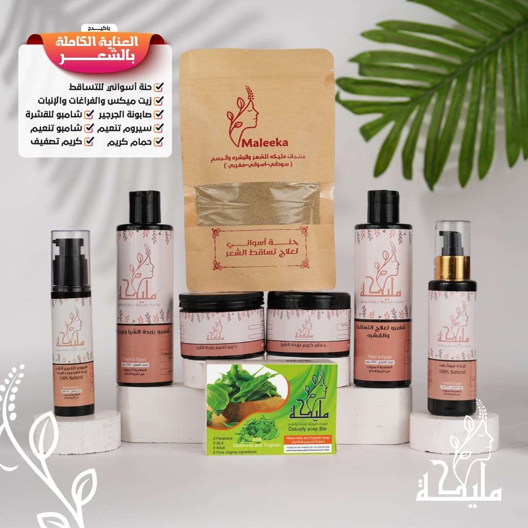 عبارة عن ٨ منتجات لحل كل المشاكل المركبه للشعر ١-شامبو القشره للقضاء على القشرة أولا وعمل تنظيف عميق لفروة الرأس الحنه الأسوانى لوقف التساقط اى كان نوعه صابونه الجرجير وهى مكونه من زيوت طبيعية زي