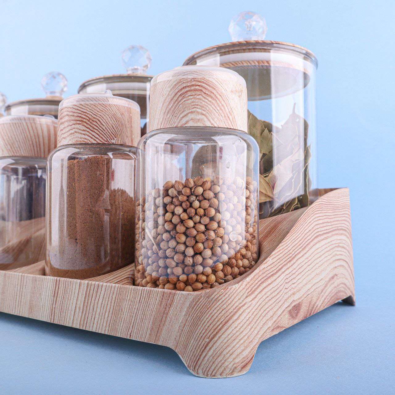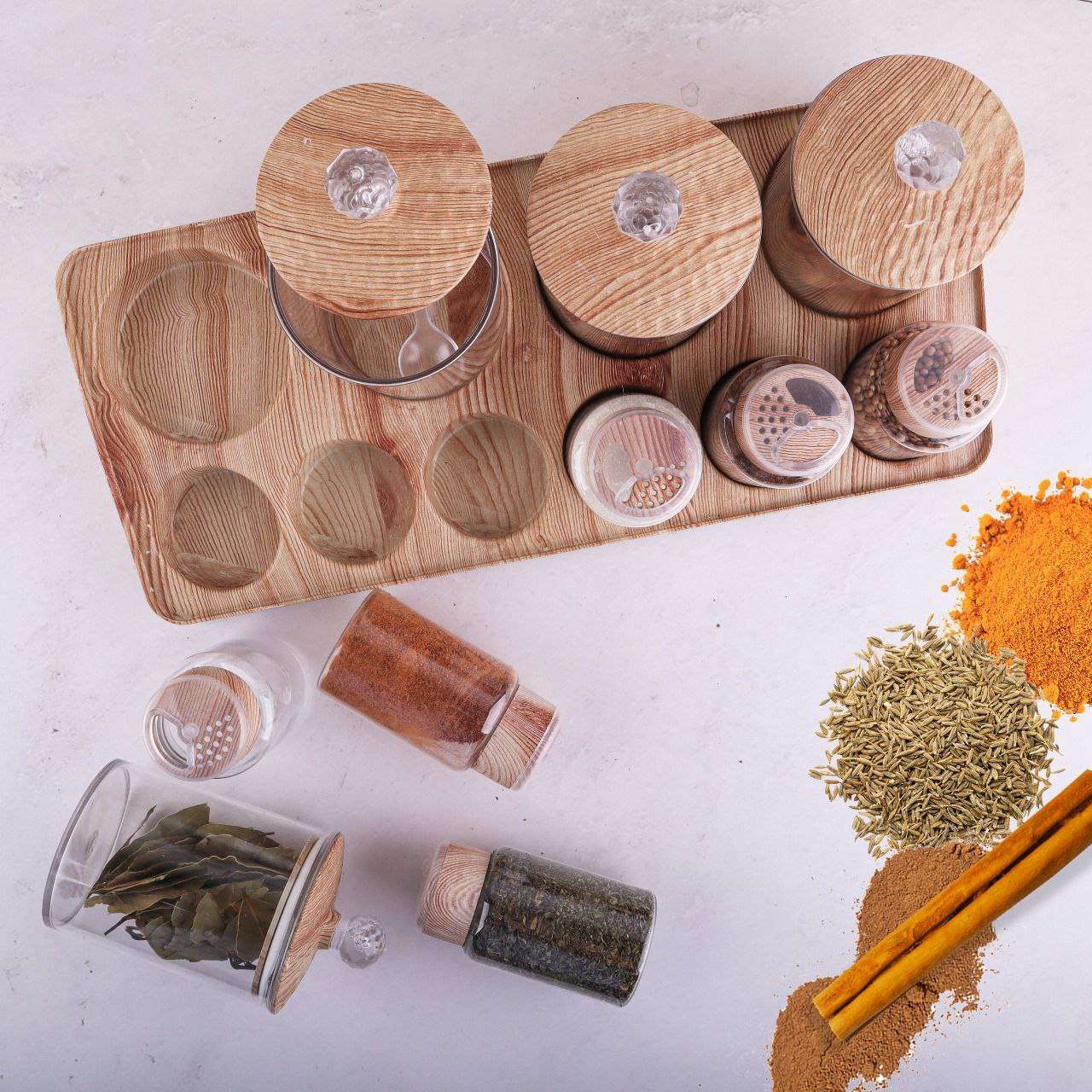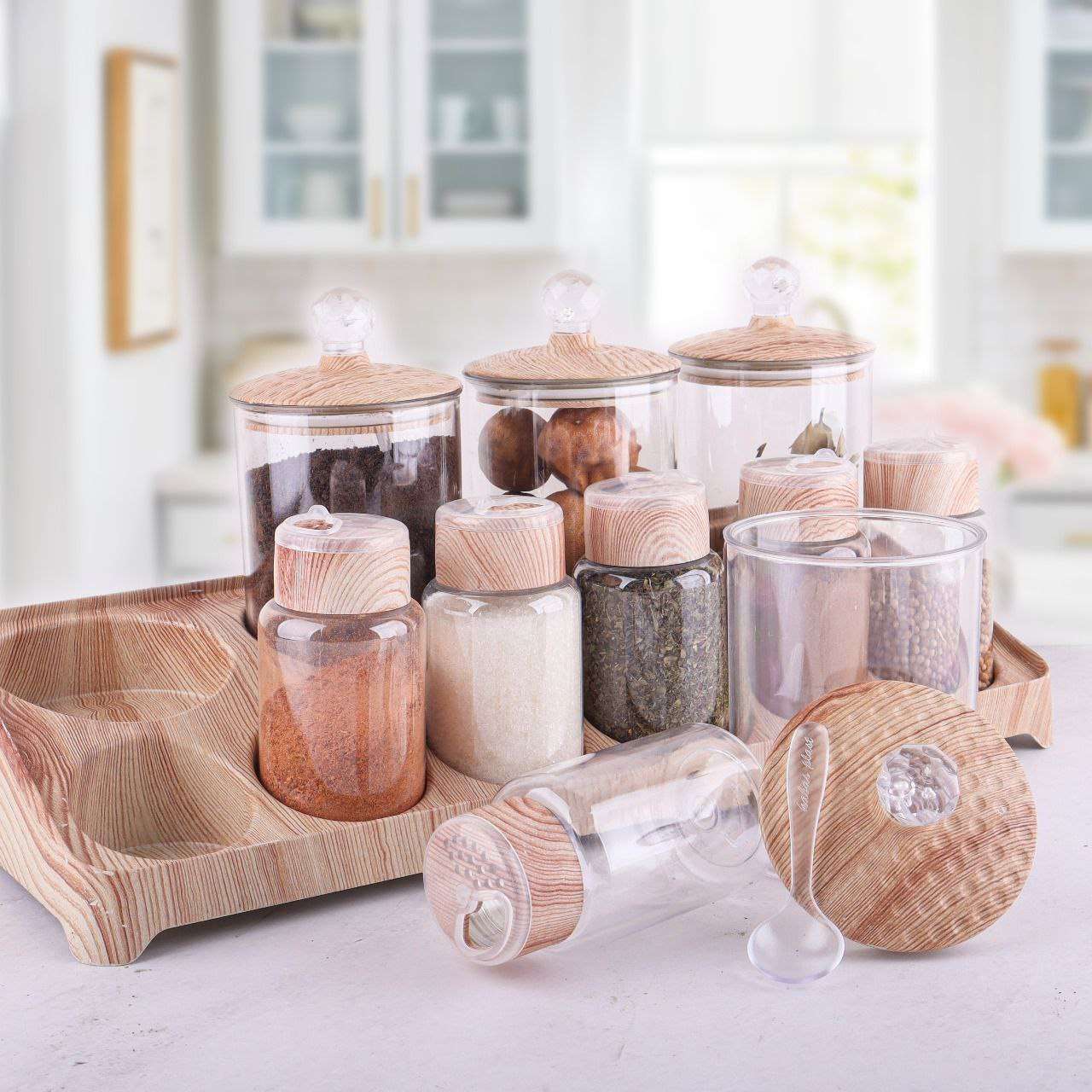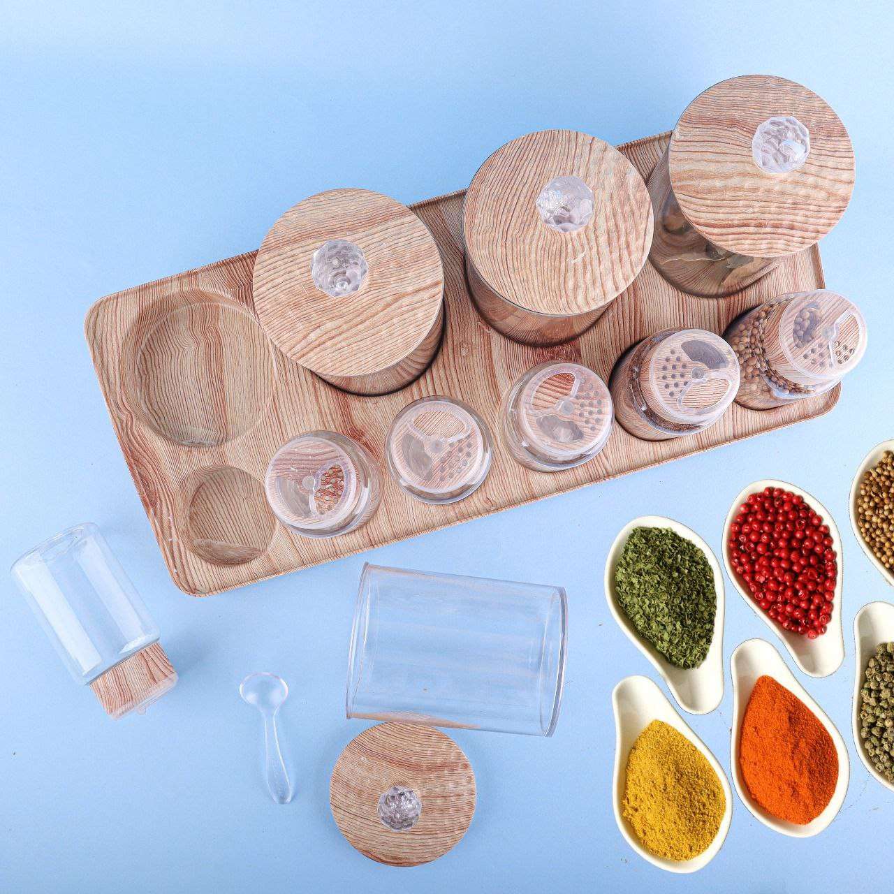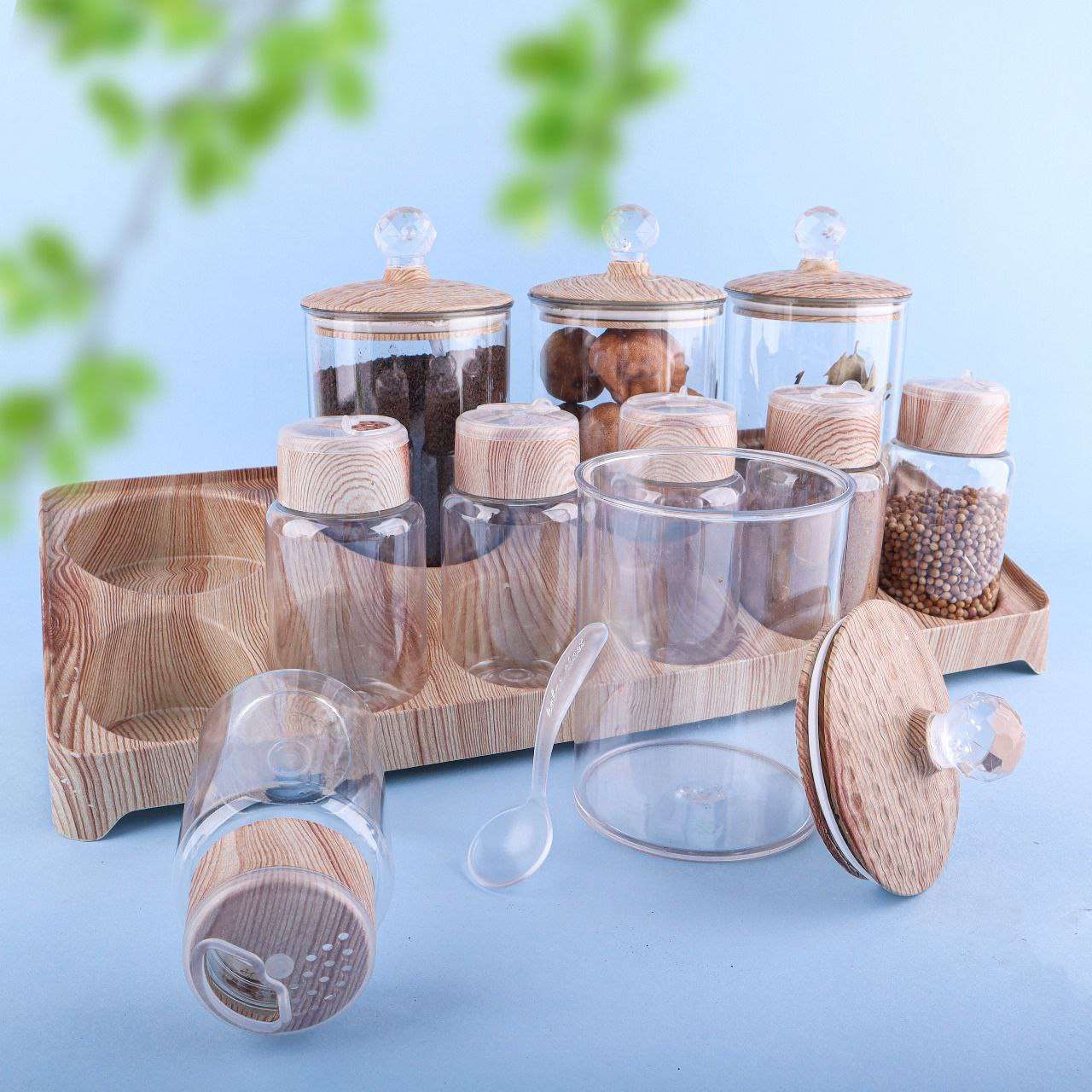 🔥 الجديد شديد واحنا ملوك الجديد 🔥 💥 طقم توابل ميكس 10*1 💥 ✏️طقم مكون من 10 قطع ✏️4 قطع مقاس 300ml اكرلك ب أغطية مزودة ب جوان لمنع التسريب ب ألوان خشبية مميزة ✏️6 قطع ملاحة صغيرة بلاستي