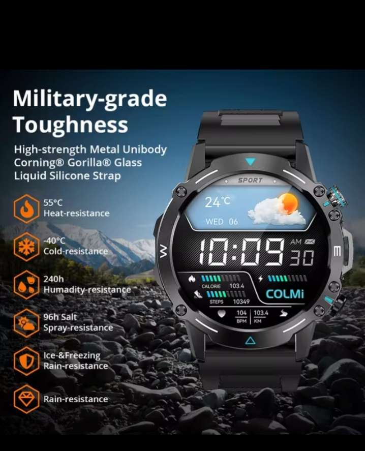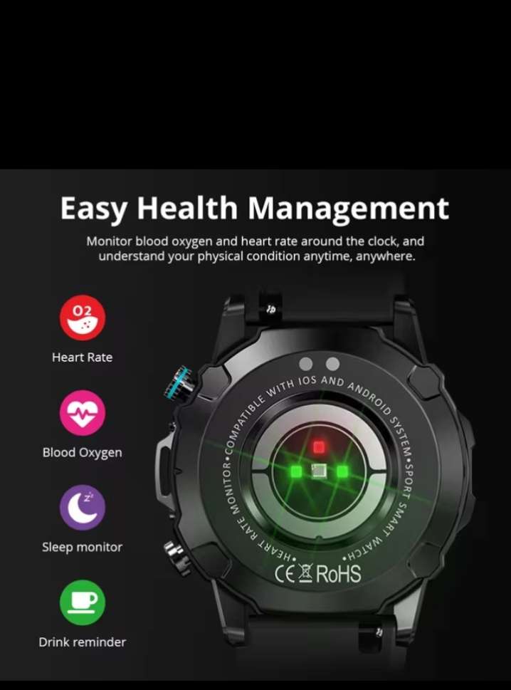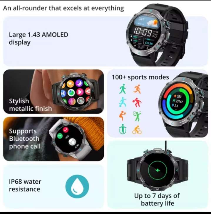 شاشه اموليد باضاءه الف شمعه اسبيكر وميكروفون لإجراء المكالمات سينسور قياسات صحه ورياضه معتمده ضد المياه ضد الصدمات ربط كامل بالموبايل بجميع الاشعارات لغه عربيه بطاريه تدوم لايام خاصيه