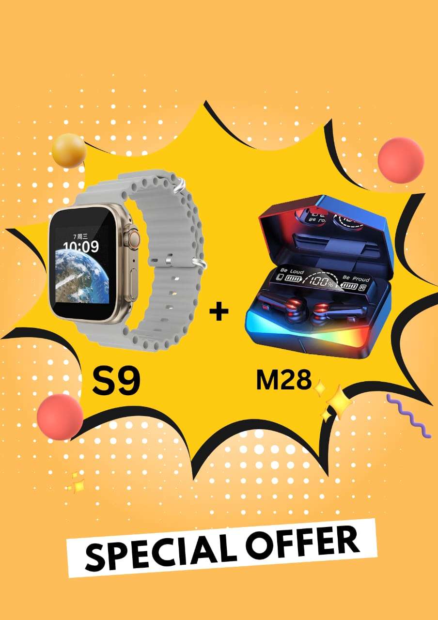 عرض ساعه s9 ultra + ايربودز m28 لعشاق الموسيقي والألعاب سماعه M28 سماعه البلوتوث M28 الأعلى جودة سماعة وباوربانك بنفس الوقت و طبعا ممكن تشحن التلفون باستخدامها. فيها مرايه اماميه ومزوده بإضاءة RGP