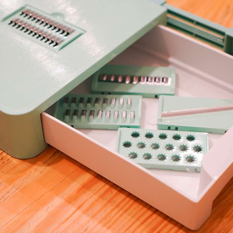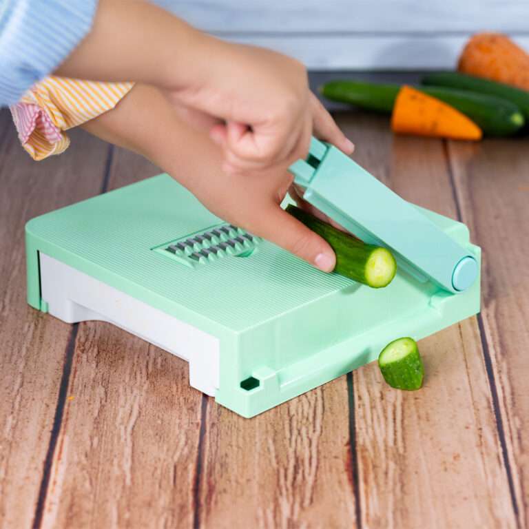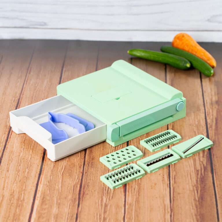 • ميزات المنتج: • معاكي قطاعة مسطرة بتقطعي بيها الخضراوات والخص والخضرة بسهولة وبالمقاس اللي انتي عايزاه • معاكي 5 شفرات مختلفين للبشر السميك والرفيع • كمان وفرنالك غطا بتقفلي بيه مكان الشفرات لو ه