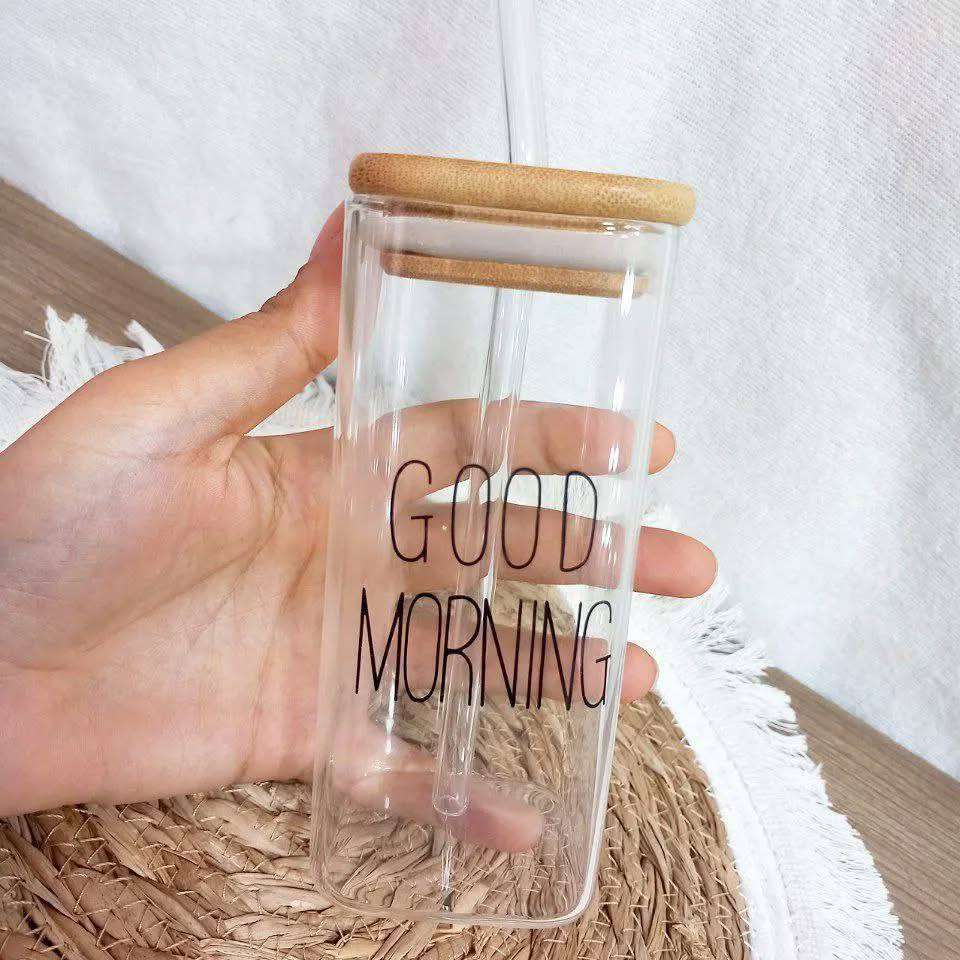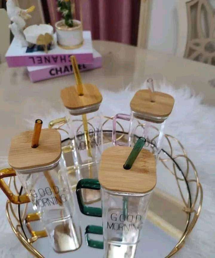 كوب شاليموا مربع بيركس جود مورنينج مج بيد الوان بغطاء خشب مستورد بايركس مستورد زجاج بيستحمل حراره وبروده سعه400مل بغطاء خشب و معاه شاليموه زجاج