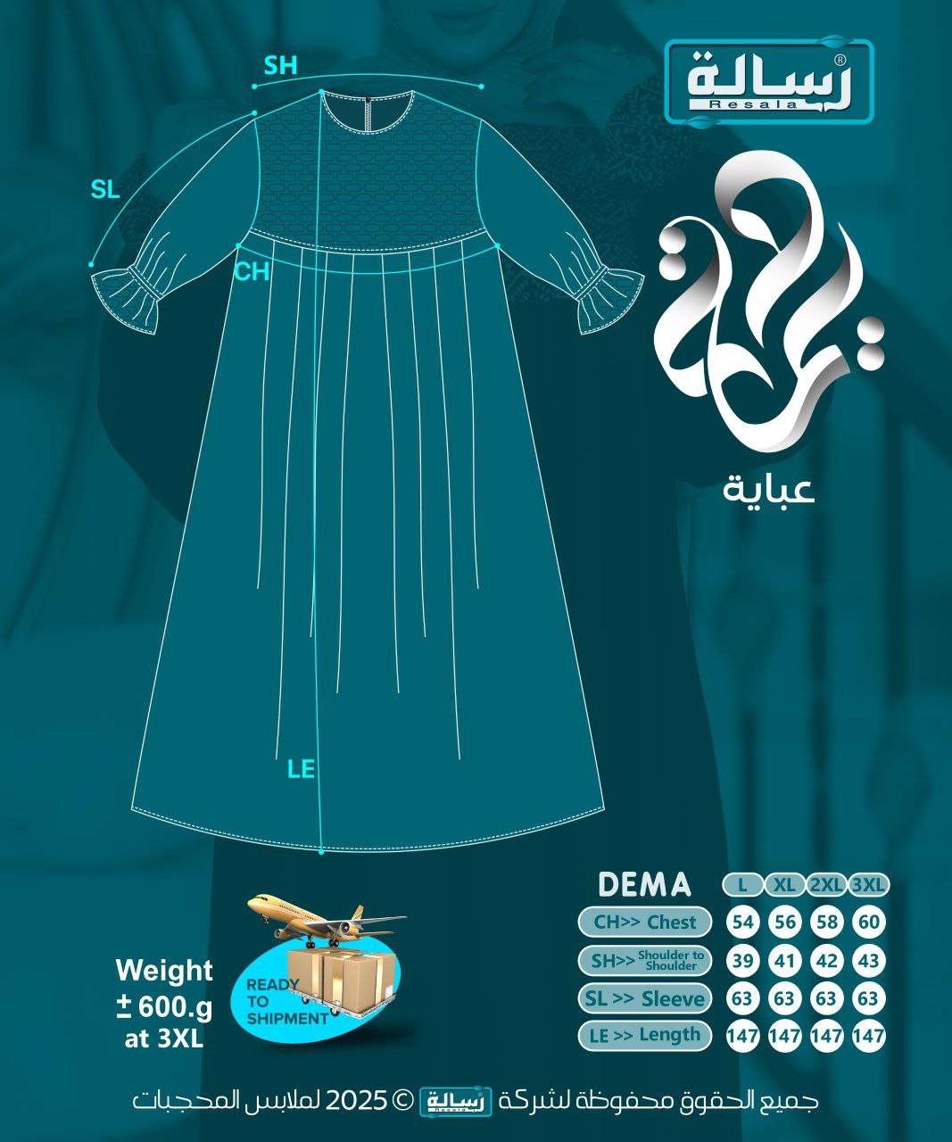 الجديد من براند رساله 🫶 موديل: ديمه🫰♥️ ماتريال: كريب عالي الجودة 🔥 مقاس: متوفره ب 4 مقاسات L , XL , 2XL , 3XL المقاسات بنصف محيط الصدر: L : 54 CM XL: 56 CM 2XL: 58 CM 3XL: 60
