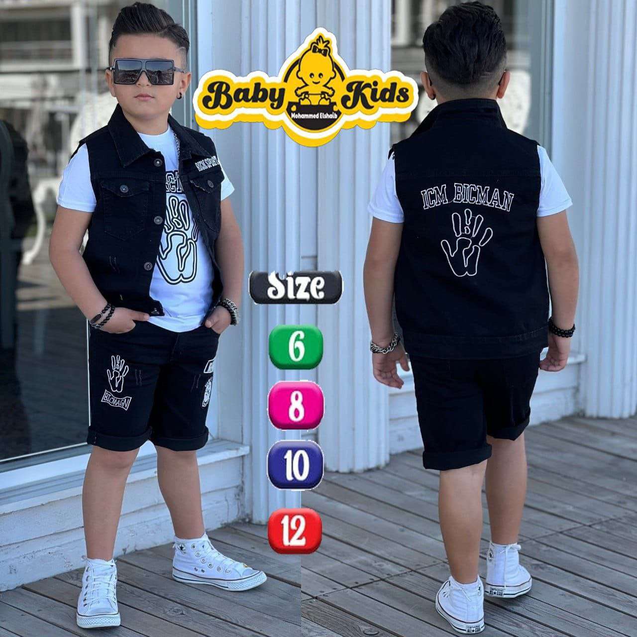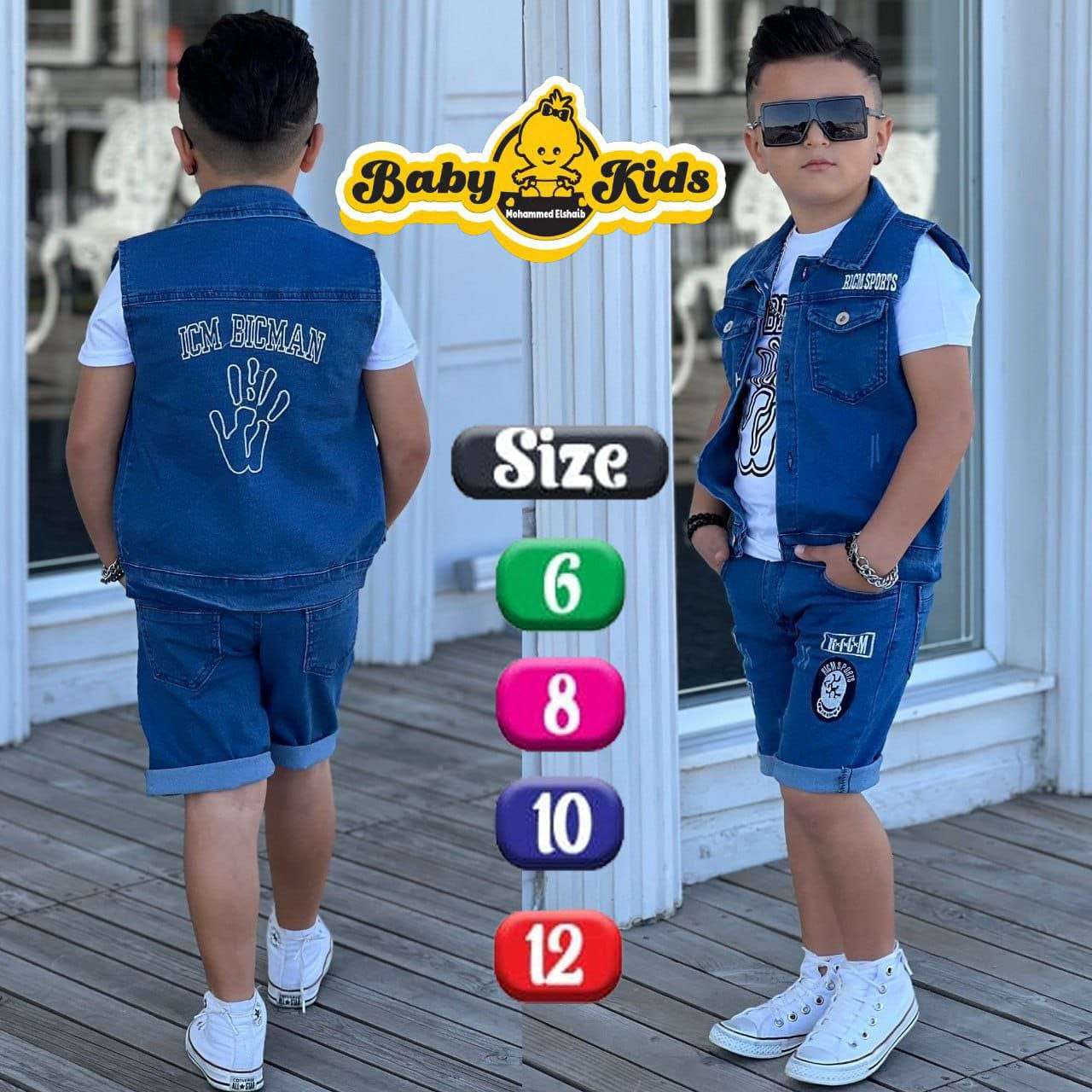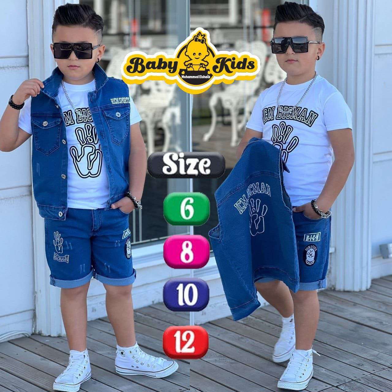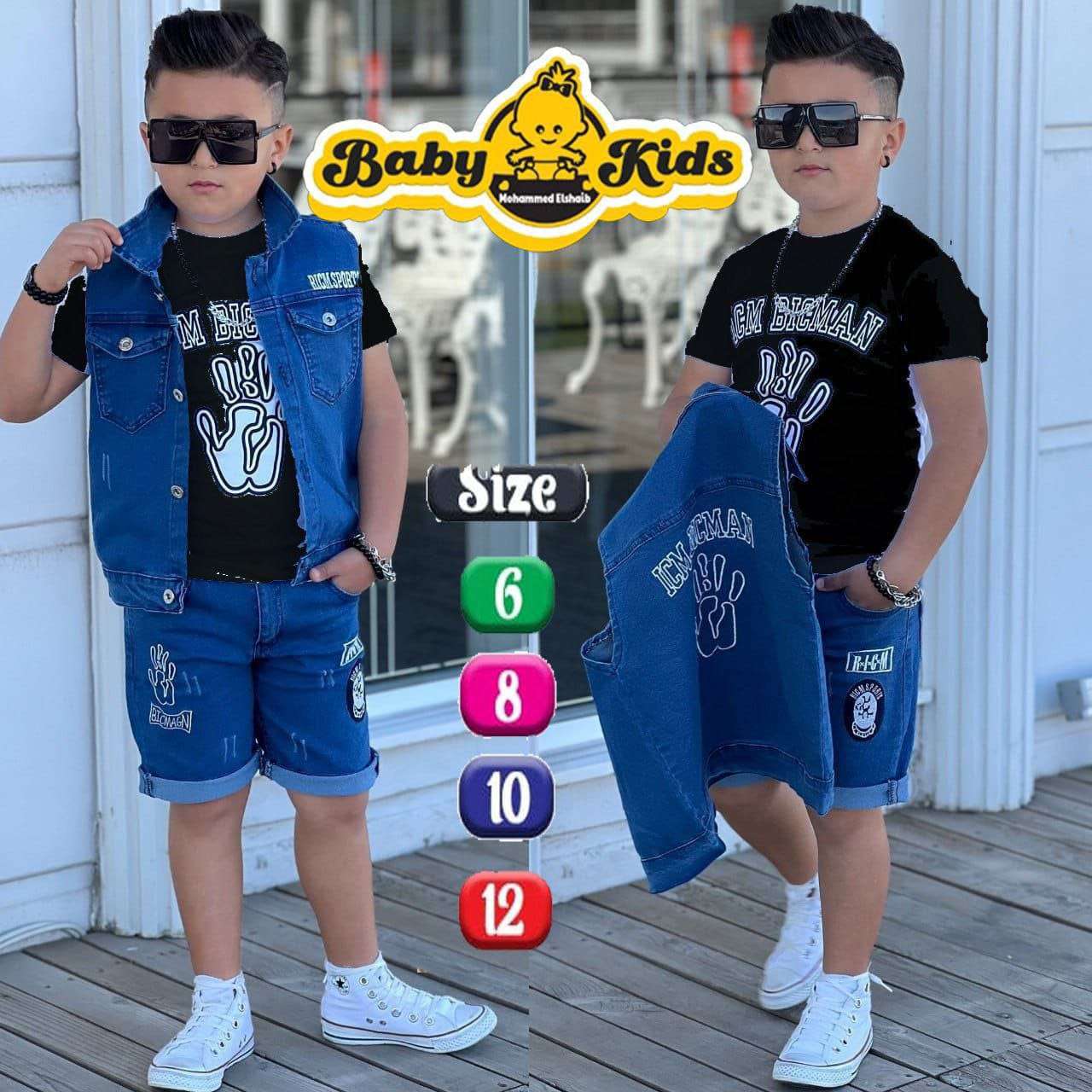 طقم اولادى 3 قطع ،بنطلون جينز رباعية وتيشرت سنجل ليكرا قطن وشميزر بولي٤٥٠ج.م